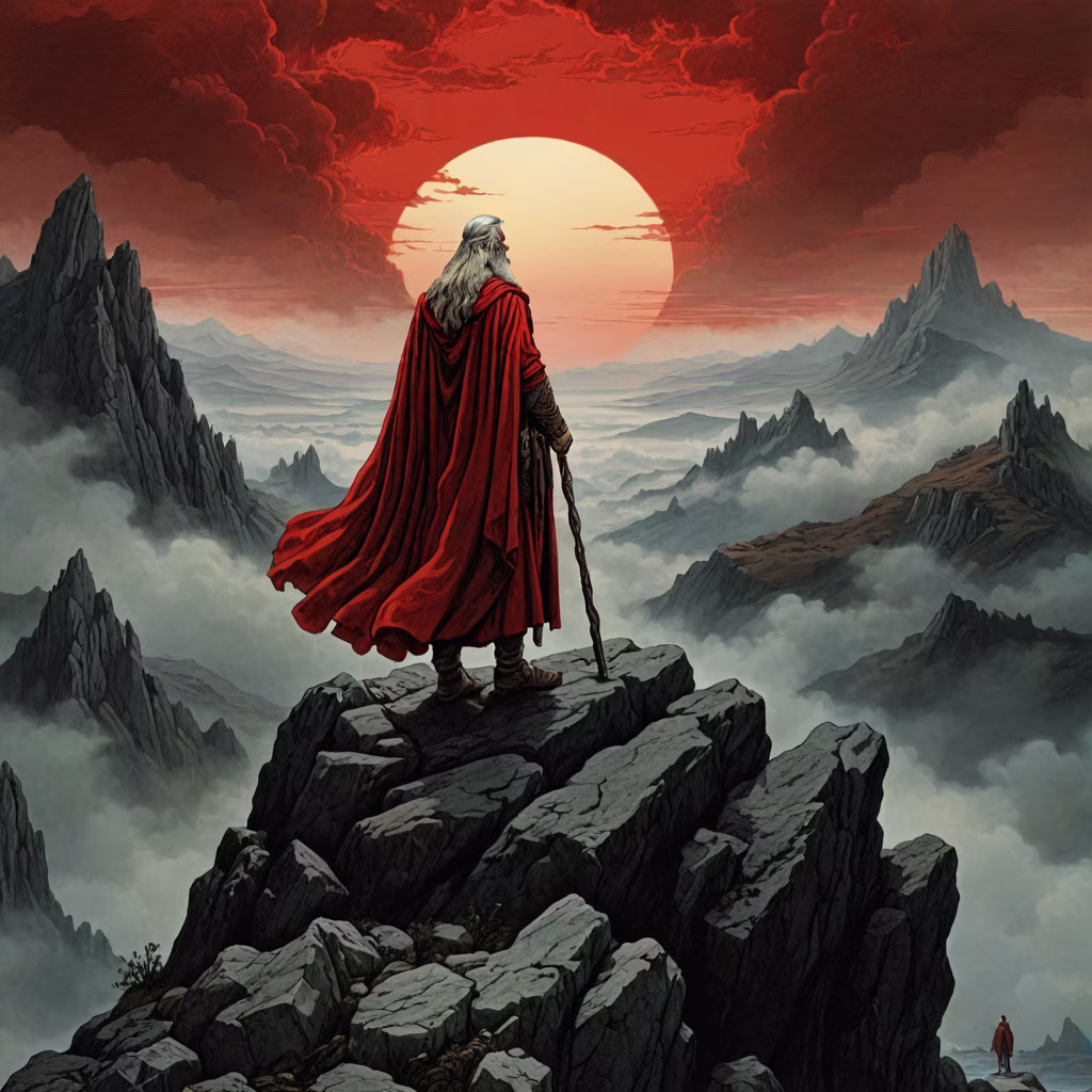Prompt: Odin with his red cloths, standing on a rocky promontory with a sea of fog over the mountains, inspired by Wanderer above the Sea of Fog by Caspar David Friedrich and illustrations colour by Gustave Doré.