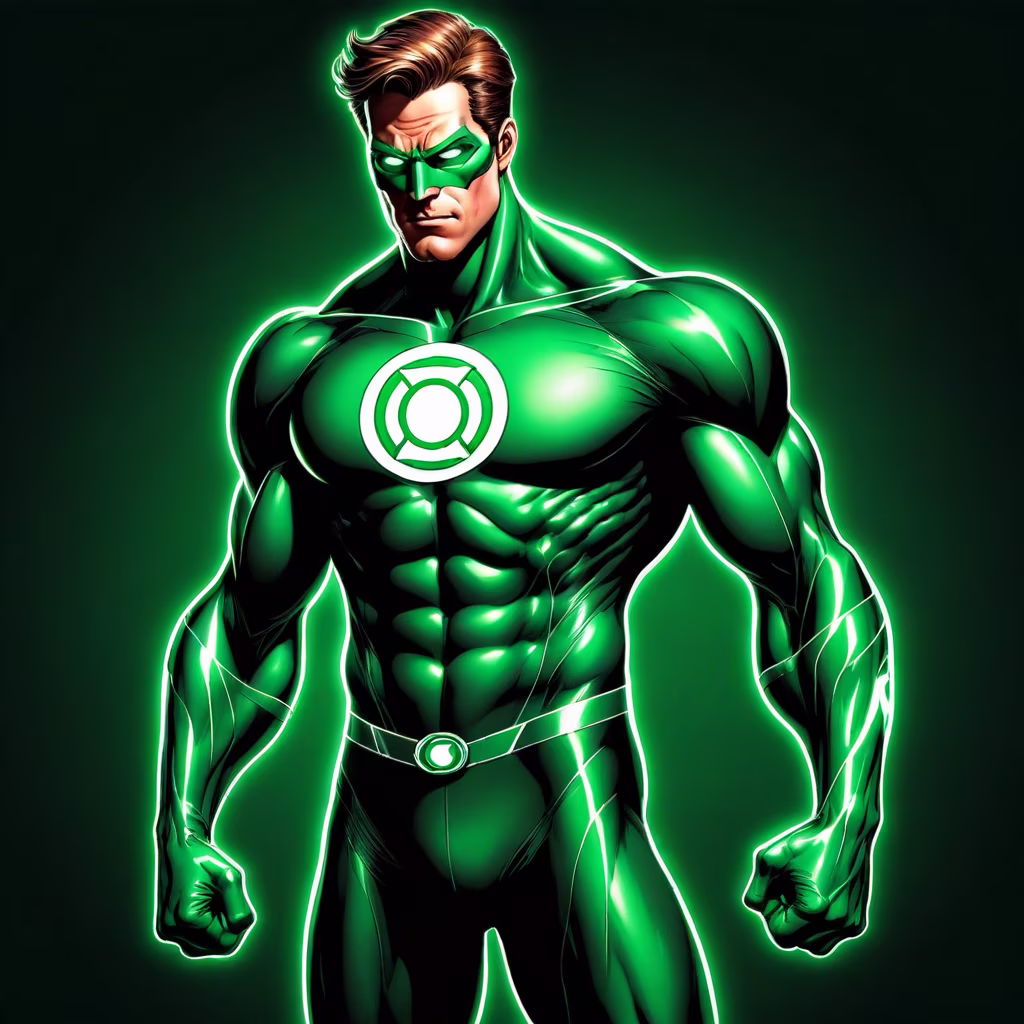 Prompt: green lantern super hero,artistic genius illustrations,detailed,muscular body ,aura around him,dark background,