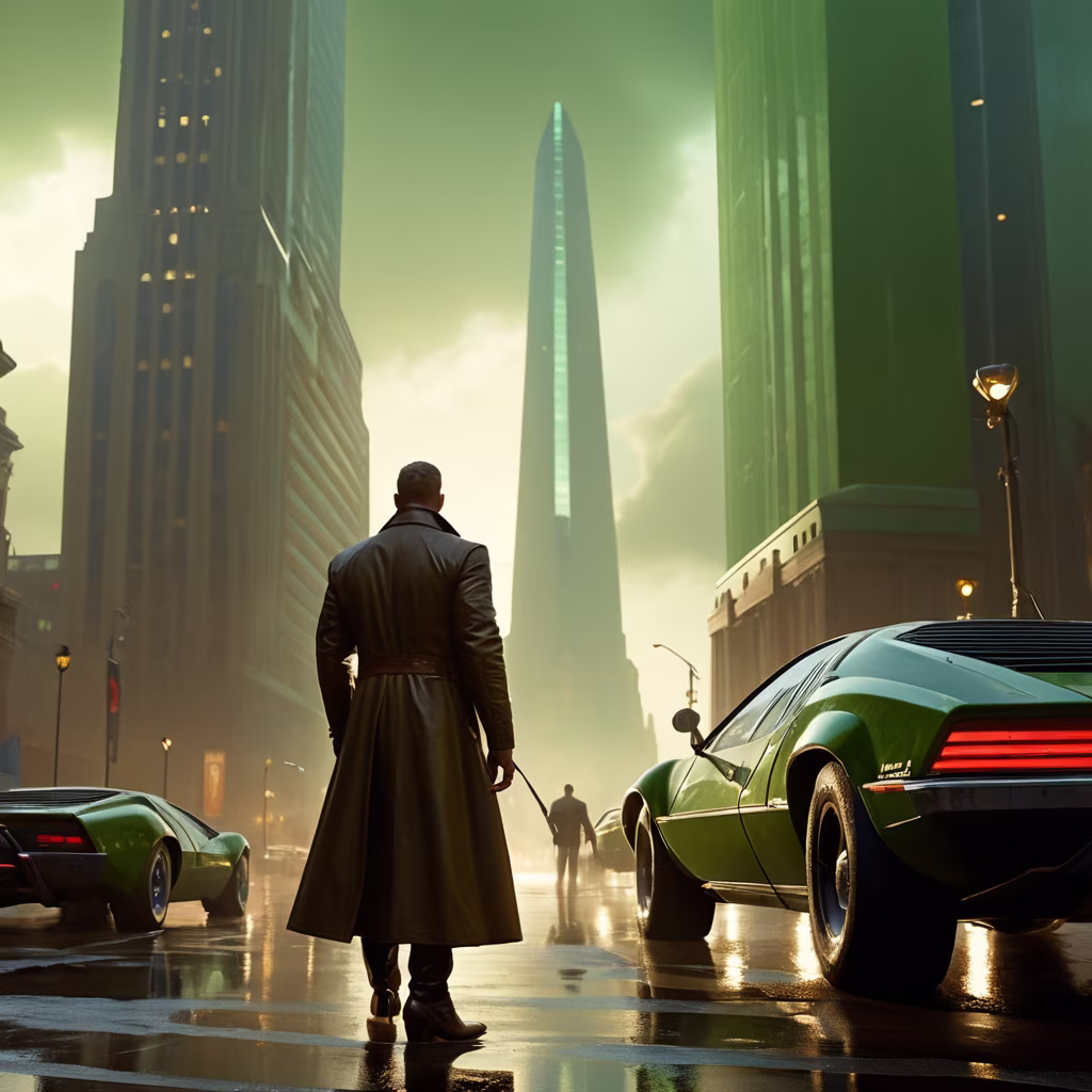 Prompt: [atmospheric digital painting, ominous post-apocalyptic plaza by Syd Mead, towering monolith, eerie green tanks, cinematic perspective, Donato Giancola's dieselpunk, dramatic, Roger Deakins lighting, Anders Zorn-inspired, rain-soaked metropolis, hyperrealistic reflections, Leyendecker figures, 32K, masterpiece|cityscape by jeremy mann, expressive brush strokes, green blade runner]