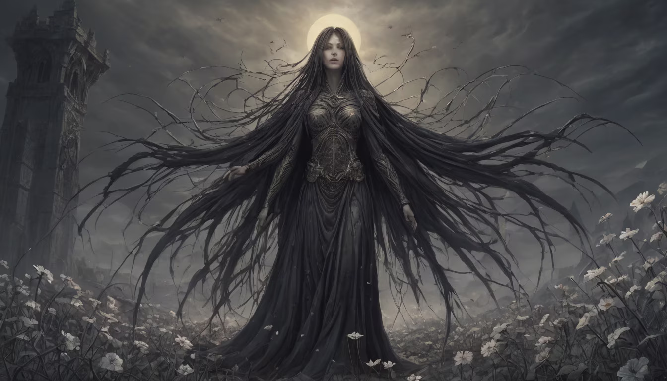 Prompt: The Sorrowful Banshee: A spectral maiden draped in tattered robes, her mournful wail echoes through the forsaken citadel. She floats above a sea of withering flowers, each petal stained with the tears of the fallen. With a gaze that pierces the soul, she commands the shadows to dance and attack. The air is thick with sorrow as she laments the tragedies of ages past, drawing strength from the anguish she invokes. In the style of Dark Souls, Zdzisław Beksiński, HR Giger, Guillermo del Toro, Guy Aitchison