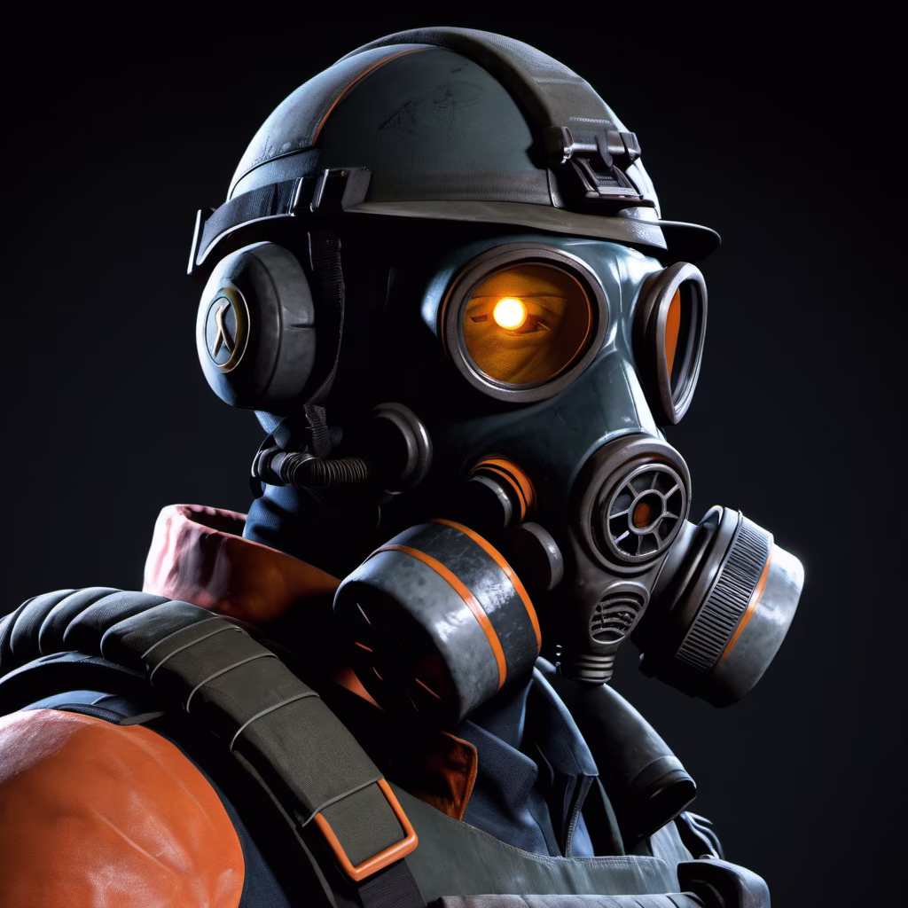 Prompt: profile picture of half-life valve soldier, perfect lighting, dark background, ultra detailed, gas mask, constrast 3 point-lighting, bloom eyes, bloom, depth of field, sharp focus, reflective