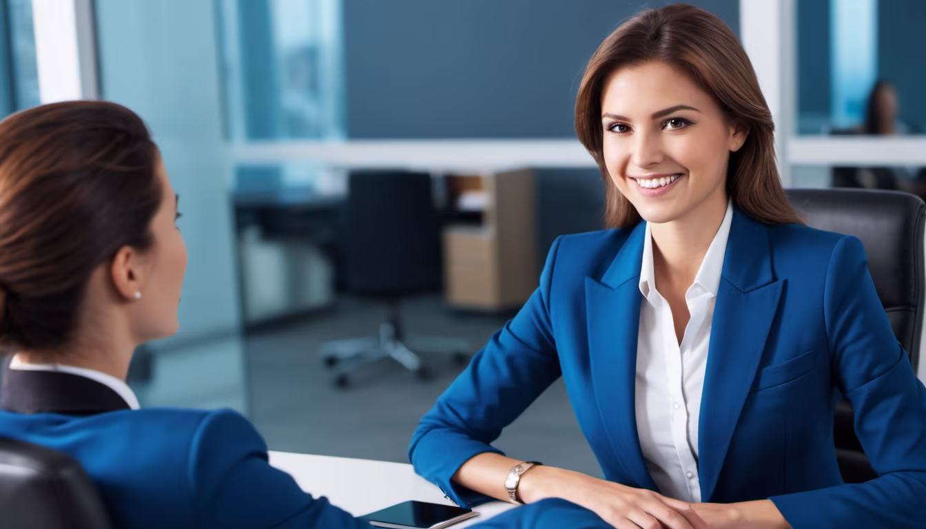 Prompt: \\\"A beautifull attrective femal boss young girl, weat blue pant coat,brown hair,attractive personality, sitting in his office executive chair, talking with an attractive man who is sit front of his female boss, her smile face, very happy, they are talking wich eachother by his business, some workers are showing nest in mirror, they shows in mirror window, mirror window left side of female boss \"/