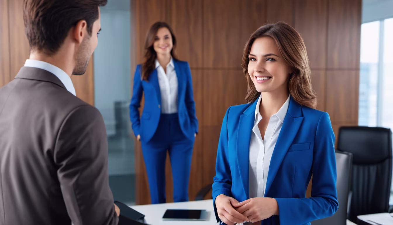 Prompt: \\\"A beautifull attrective femal boss young girl, weat blue pant coat,brown hair,attractive personality, standing in his office near her executive chair, talking with an attractive man who is standing front of his female boss, her smile face, very happy, both are standing in office,talking wich eachother his business, some workers are showing nest in mirror, they shows in mirror window, mirror window left side of female boss \"/