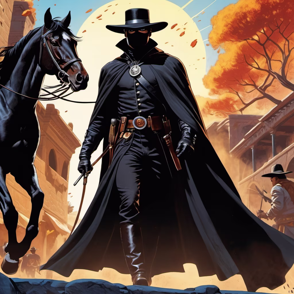 Prompt: 2d cartoon characters, full body, Zorro (Alain Delon), in black clothes, black cloak, black hat, black mask over the eyes, galloping (horseback) through an ancient Mexican (city), trees, sunrise, glow, halo, sparks, lightning, splashes of light, rays of light, aura, ready to use force and arms, dynamic action pose, dnd character, Marvel cartoon style, 1800s, Call of Juarez style, animated TV series, soft light, colored, colorful, vibrant color, high detailed background, high detail, best quality, realism, by Jack Kirby Fred Warter Frank Mille Boris Vallejo