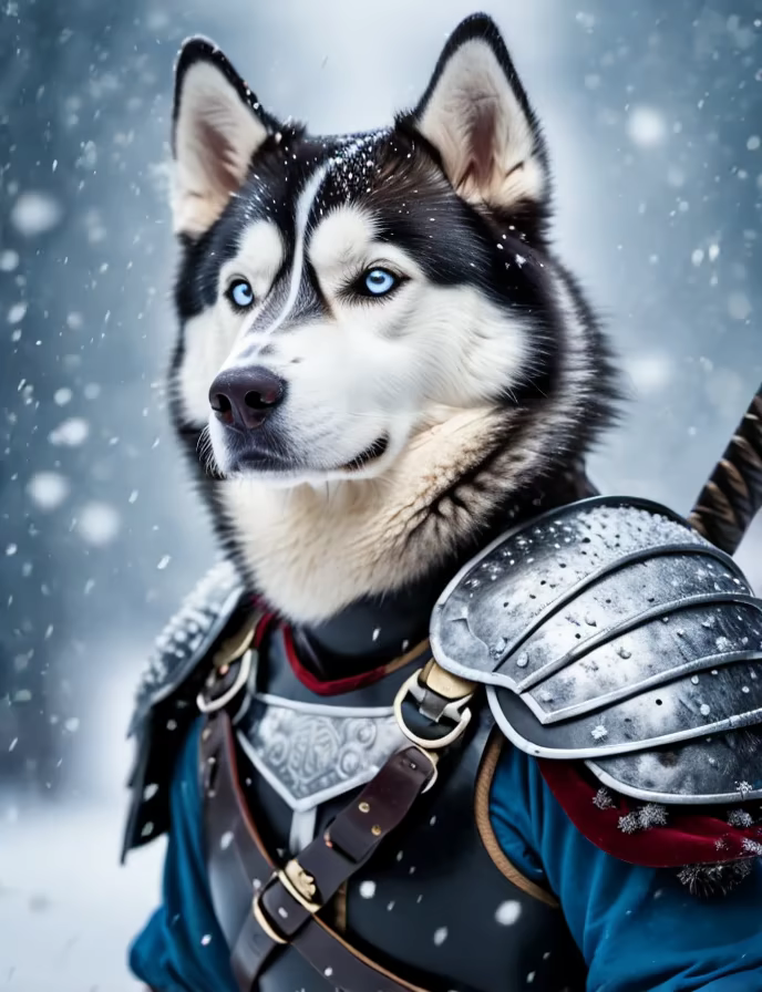 Prompt: half body portrait of an anthropomorphic Siberian Husky, clad in tattered battle armor, wields a long sword valiantly. The backdrop is a world awash in a blizzard of snowflakes and manifests in frosty, cool hues.