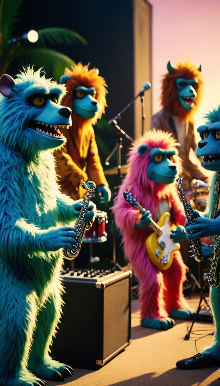 Prompt: a group of mutant jungely Dumb furry monsters giving a concert,sunset beach, Big synth, saxophone, drums , dramatic light