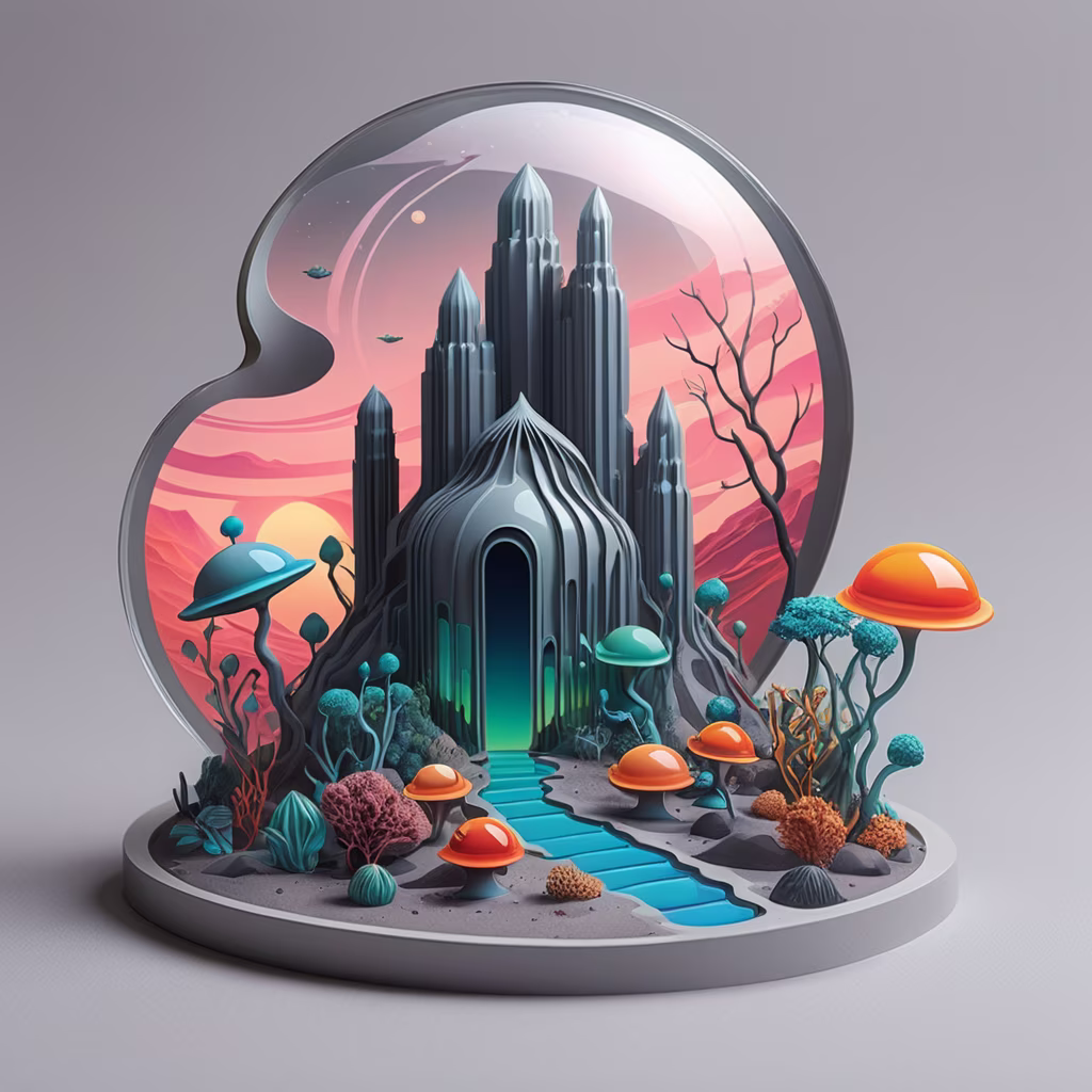 Prompt: glass-encased Martian biome, surreal diorama, distorted perspective, dreamlike hues, Rene Magritte's ethereal touch, Yoko Honda's neon palette, reflective surfaces, cosmic lighting, intricate surrealism, 16K, masterpiece.