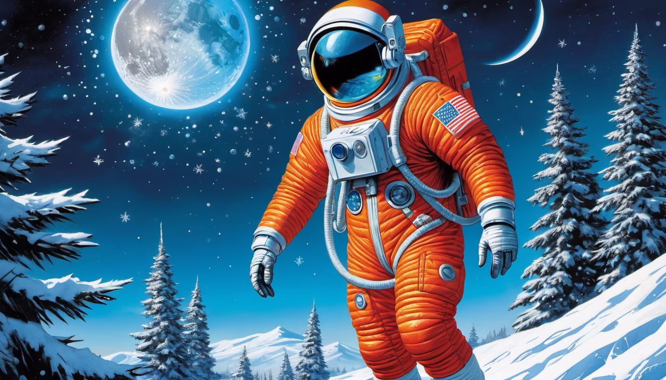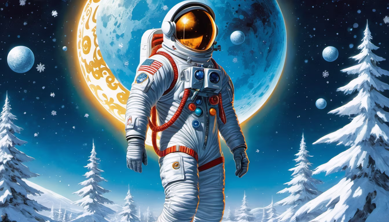 Prompt: New Year postcard, full body, astronaut in moon base NASA, snow, ice, glow, halo, sparks of light, snowflakes, splashes of light, Christmas tree decorated with toys, Christmas tree toys, gifts, extremely detailed magical complex dream space moon planet background, space, planets, constellations, galaxies, starcraft style, 70s, detailed, vibrant color, soft light, highly detailed face, high quality, bright soft light, realistic, with interesting new year elements, by Alex Ross Chris Foss