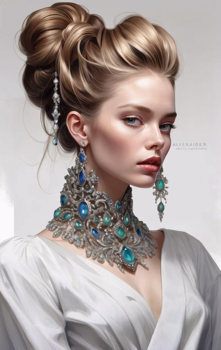 Prompt: Gorgeous model, zoom on her neck with intricate gemstone jewelry. Long updo Hairtyle, Very highly voluminous, very lofty, richly detailed, intricately textured. White shirt Alexander Mcqueen