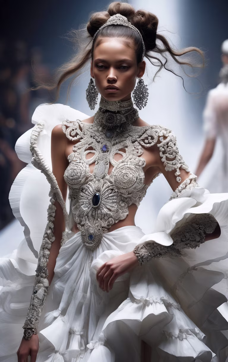Prompt: In an ethereal setting, a woman stands draped in a gown sculpted from shimmering ice, emanating a serene and glacial elegance amidst a frosty landscape, cool, serene, detailed, crystalline beauty, ethereal, art by Alexander McQueen, Elsa Schiaparelli.