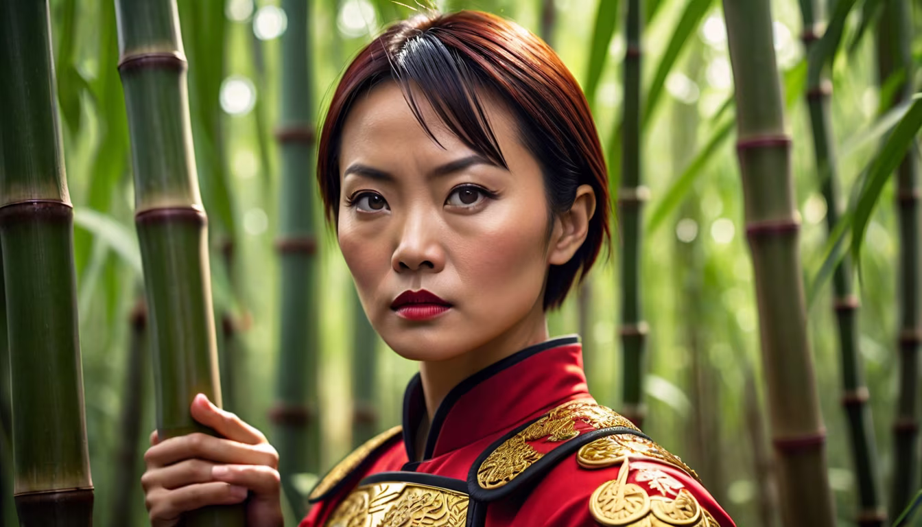Prompt: Julee Cerda, one chinese woman wearing a red uniform with golden armour protection, short hair, kung fu pose, short hair, serious face, asian woman, warrior, bamboo forest background