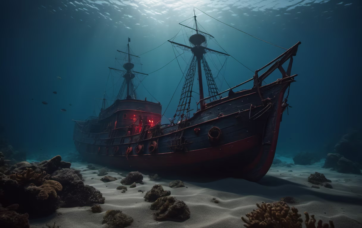 Prompt: Shipwreck, at the bottom of the ocean. at the very depth, a mysterious, mystical light in which lies a broken ancient 18th-century frigate in the Kingdoms of the Abyssal Reefs, where the red color of the ocean merges with dark gray, revealing the hidden greatness of the depths of the sea, dark noir, dark botany, surrealism, a masterpiece in the style of raw