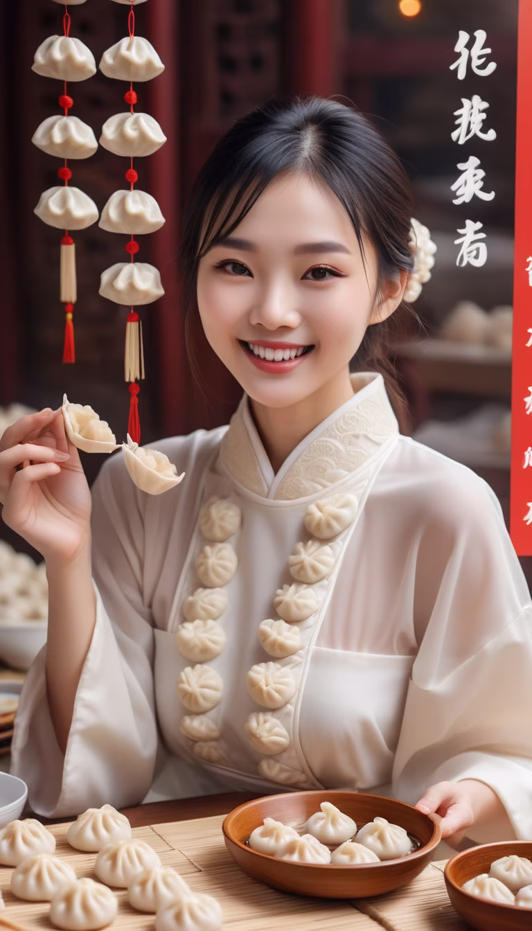 Prompt: A medical beauty chinese winter solstice poster,a beautiful Asian model in the sea of dumplings and rice dumpling,eating dumplings with happy smile,she wears white dress, beatiful face, wavy resin board style,light red and light beige,liquid light emulsion, sharp facial features
