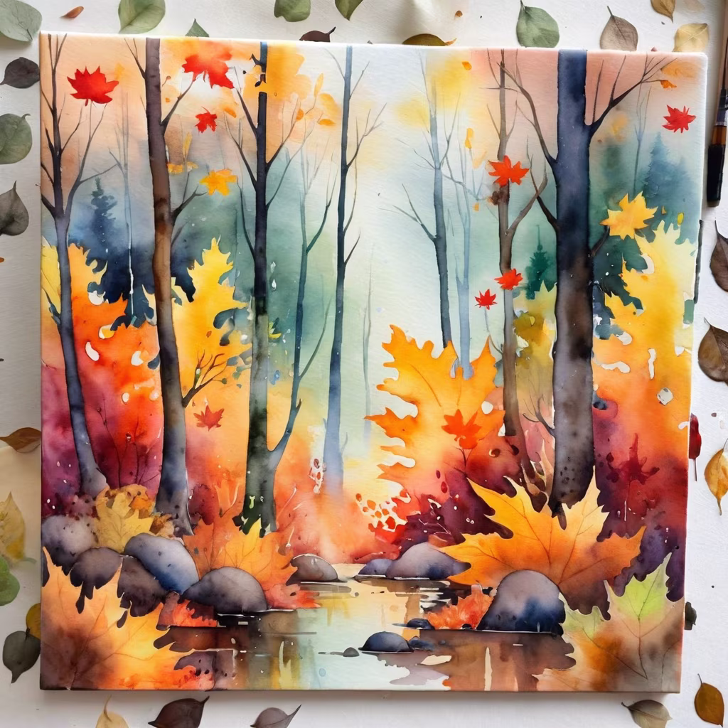 Prompt: The painting of a forest immersed in autumn colors, leaves burning like flames.