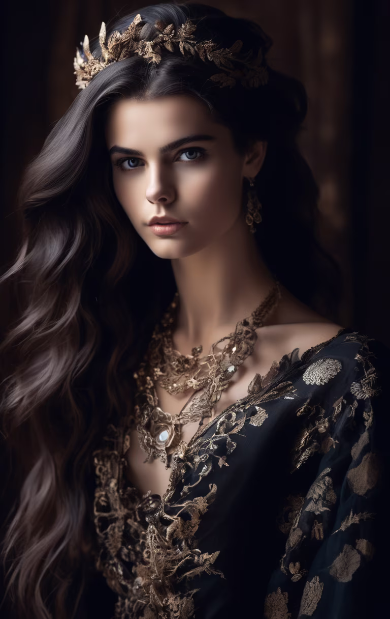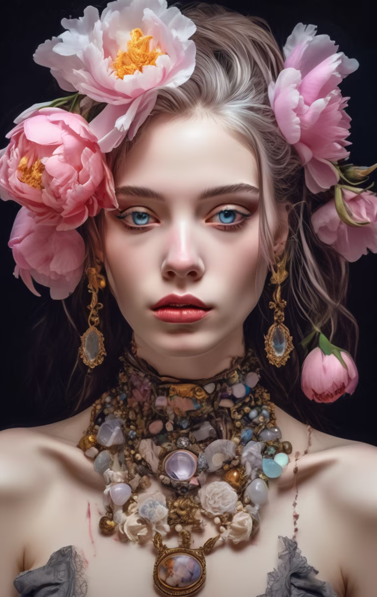 Prompt: gorgeous model, gemstone jewelry, long intricate volume hairstyle, a still life, unsplash contest winner, vanitas, moody light colors, photography from vogue magazine, insanely intricate details, trending on artforum, giger, Gerald Brom, peony