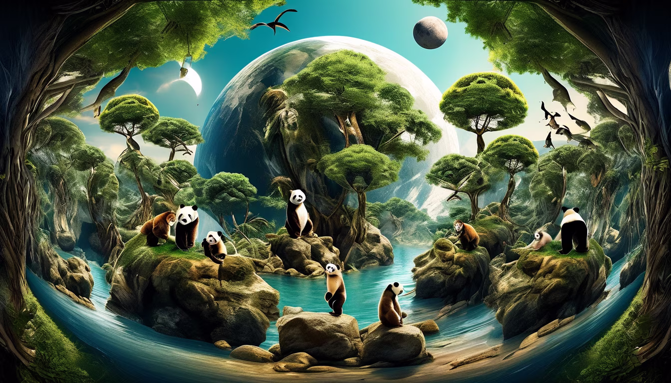 Prompt: an ethereal planet moon with wildlife🌳🌿🪵, dragons, pandas, fish that fly in the sky, birds that swim, a monkey that steals money hd 3d 32k photo fish eye lens, with people living there but the are miniature characters