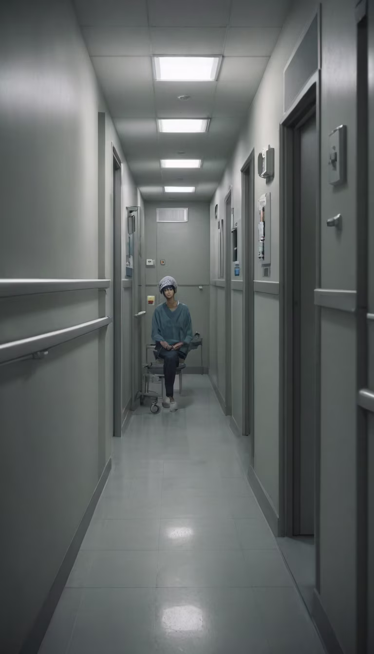 Prompt: The guy dressed in casual attire sitting alone outside an operating room, waiting for his surgery, his posture conveying a mix of calm and apprehension, the quiet hospital hallway highlighting his solitary moment, a scene of contemplative solitude.