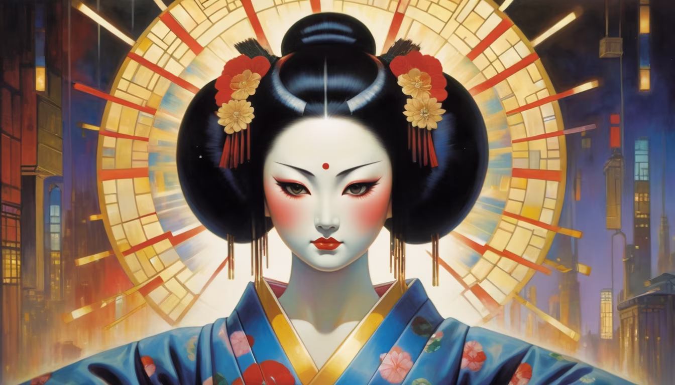 Prompt: The breathtaking display of time dilation is transformed into an awe-inspiring, lambent aura that shimmers with effulgent, otherworldly beauty and ethereal apparitions. The iridescent, cretaceous, and pearlescent triadic rhythms pulsate with electric fervor, masterfully creating a surreal ambiance replete with radiosity, ray-marched lighting, flying spin-kicks, and kabuki theatrics. The display of illicit impulses and geisha training transports the viewer to a new dimension, capturing their imagination through cinematic illumination and edgy pointillist techniques. World-renowned artists such as Dave McKean, Ilya Kuvshinov, Nychos, Ryohei Hase, and Igor Morski, just to name a few, bring their breathtaking mastery and flawless artistry to capture the cyber-enigmatic essence of this mystical realm. The Blade Runner aesthetic created by Chaves, Botero, Mondrian, Justin Maller, Shepard Fairey, and Kasure immerses the viewer in a world of madness and rapture, where the lines between reality and fantasy blur.