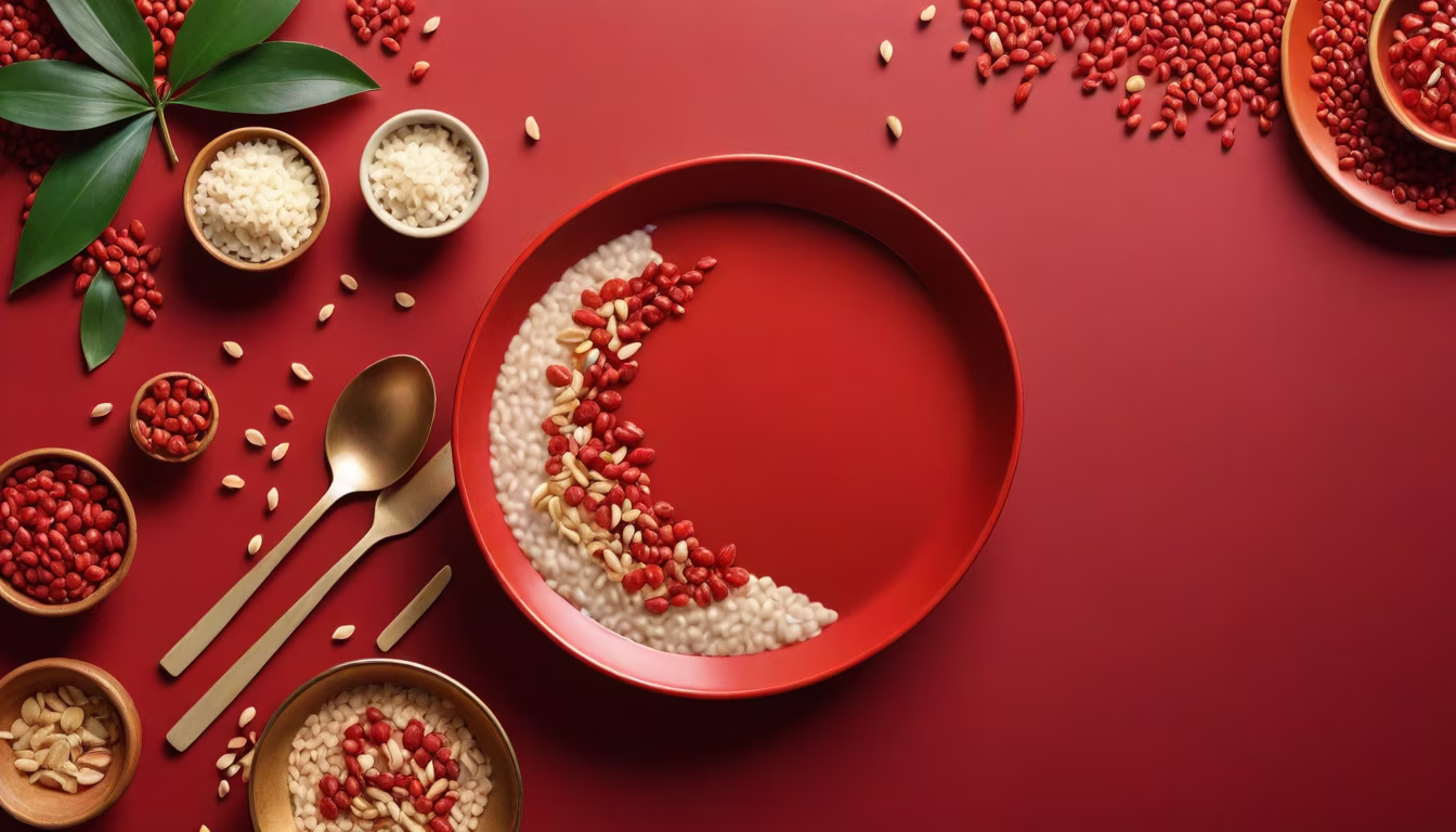 Prompt: Menu background image for Laba Festival 2024, characterized by a red color palette, featuring Laba porridge. The holiday-themed background should avoid complex graphics in the central half of the image.