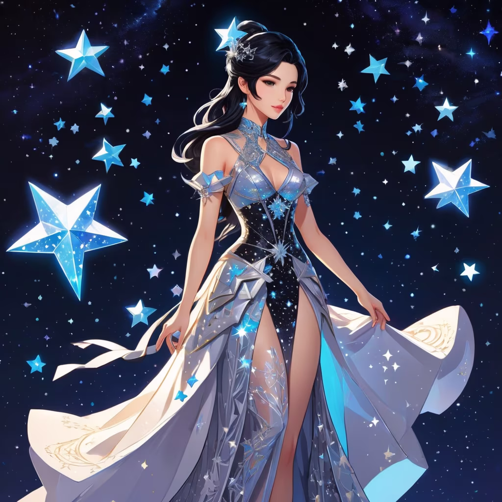 Prompt: A woman wearing a dress made of stars, black hair, very detailed, mixed with square enix