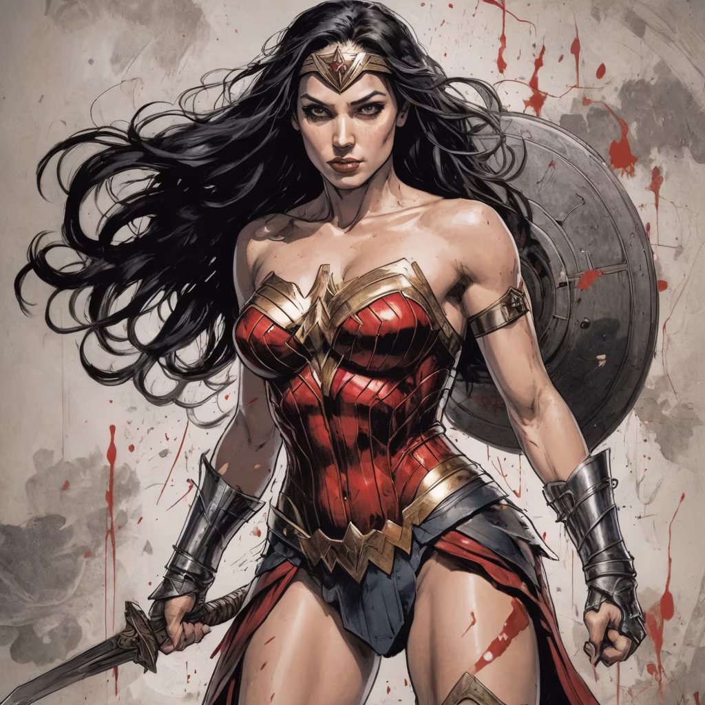 Prompt: renaissance art blood and black silver armor Wonder Woman rage energy by marvel studio and Pablo Picasso and leonardo da Vinci and jim mahfood