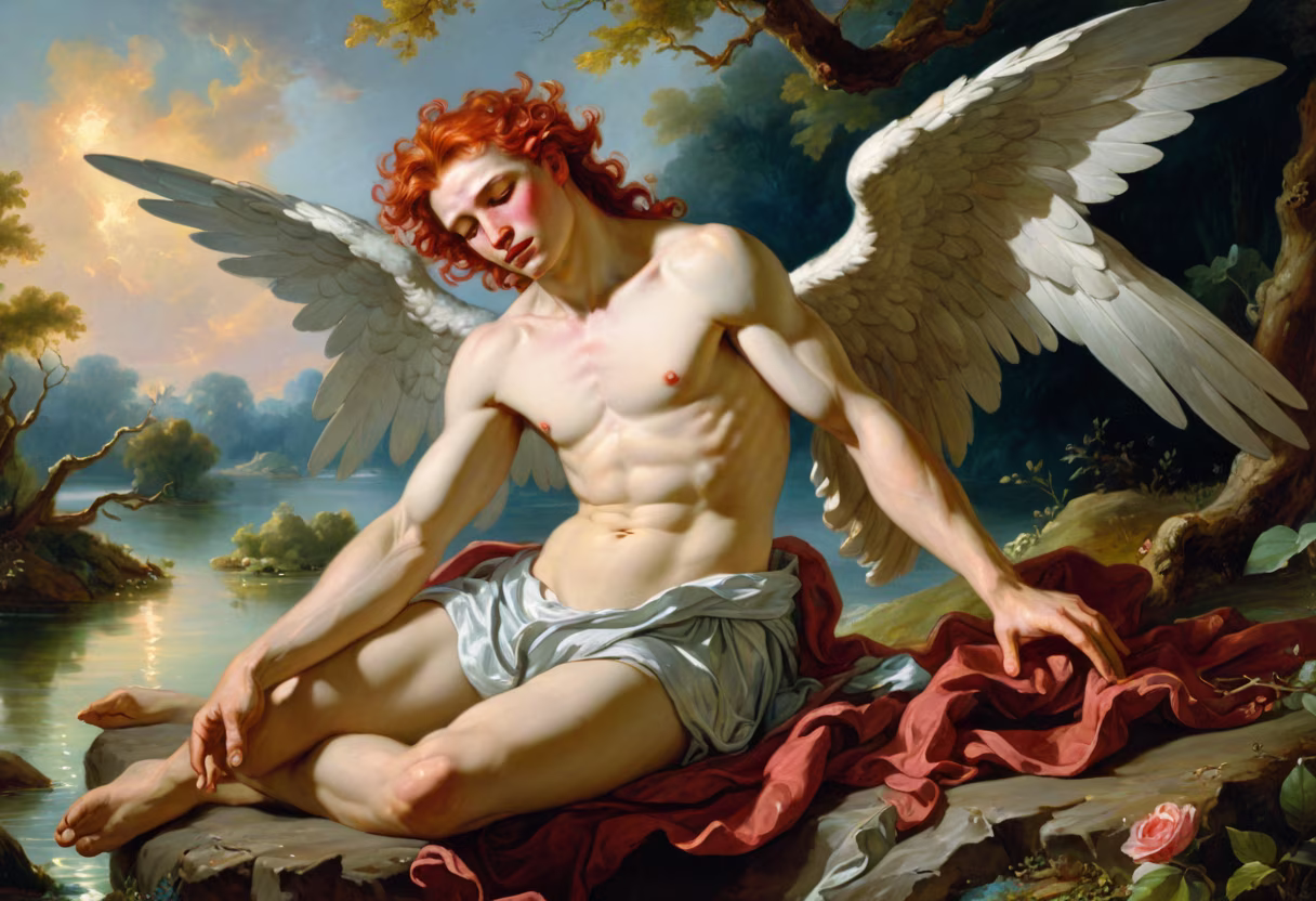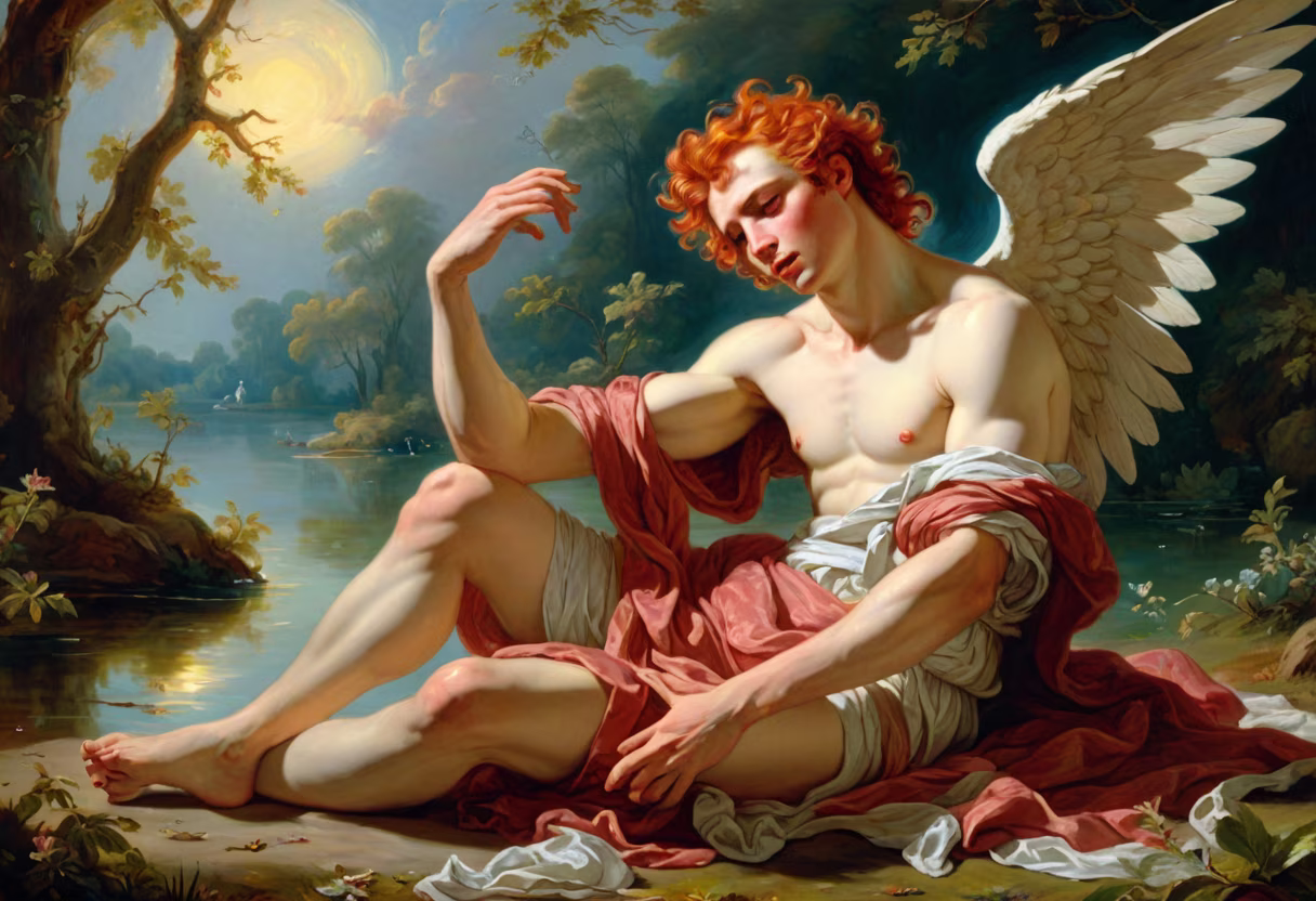Prompt: man, muscular angel, thin, perfect body with curves, curly medium red hair, shirtless, abs, near a lake, fallen angel, red hair, painting by François Boucher, painting by Jean-Honoré Fragonard, painting