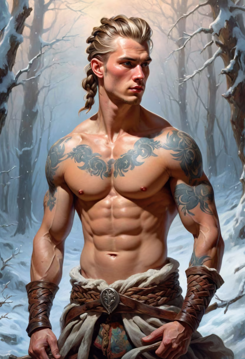 Prompt: painting, nordic ancient house, warrior nordic man, tattoo chest and body, warrior, tattoos, beautiful athletic body man, thin, young man, shirtless, nordic braided hair, nordic hair, winter yard, winter, shirtless, abs, serious face, wonderful, painting by François Boucher, painting by Jean-Honoré Fragonard, painting, warrior nordic