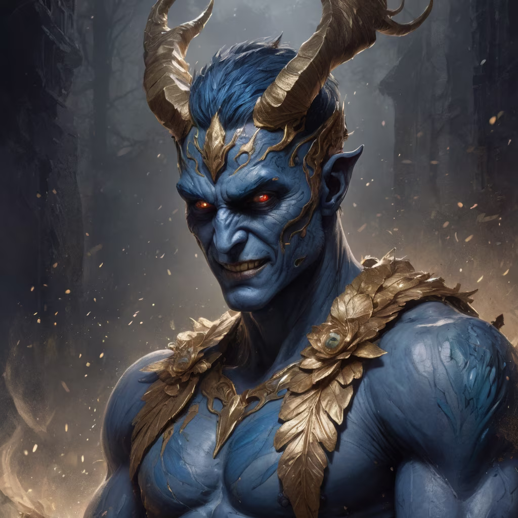 Prompt: textured Speedpaint with large rough brush strokes and paint splatter, male assasin devil with realistic blue skin, large intricate peacock tattoos, horns with gold runes, terrifying smile, wide open arms, gaudy amounts gold adornments, character concept sketch, acrylic, claustrophobic, a dark box, dimly lit, jaggered, distant howling, error, sinister, triggered, alarming, a mysterious thin fog, blanched wet, flickering of light, hyper detailed, a detail with perfection and enhancement, loose brush strokes, by Denis seraphim, Luan Nguyen, by Jeremy Mann, Carne Griffiths, Junji Ito, Robert Oxley, Ismail Inceoglu, muscular body, misty Norse landscape, sharply detailed, dramatic lighting, 16K