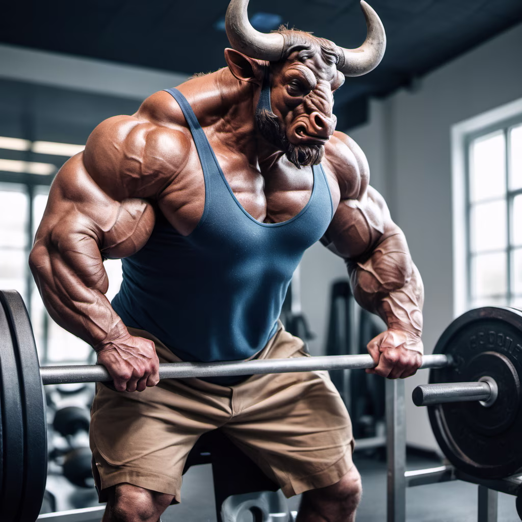 Prompt: Create an ultra-realistic image of a muscular bull, with bulging veins and a determined posture, working out in the gym, ultra realistic, 8k, photographic.