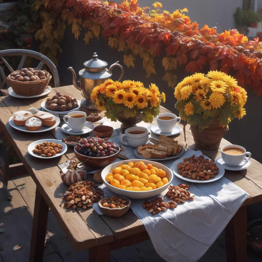 Prompt: Autumn terrace breakfast, Breughel, Hassam, warm sunrise, vine leaves \u0026 grapes, pots of mums \u0026 chrysanthemums, wooden table laden with nuts, breads \u0026 fruits, coffee steam, soft morning light, chestnuts \u0026 hazelnuts, rustic textures, photorealistic details, 4K resolution, digital painting.
