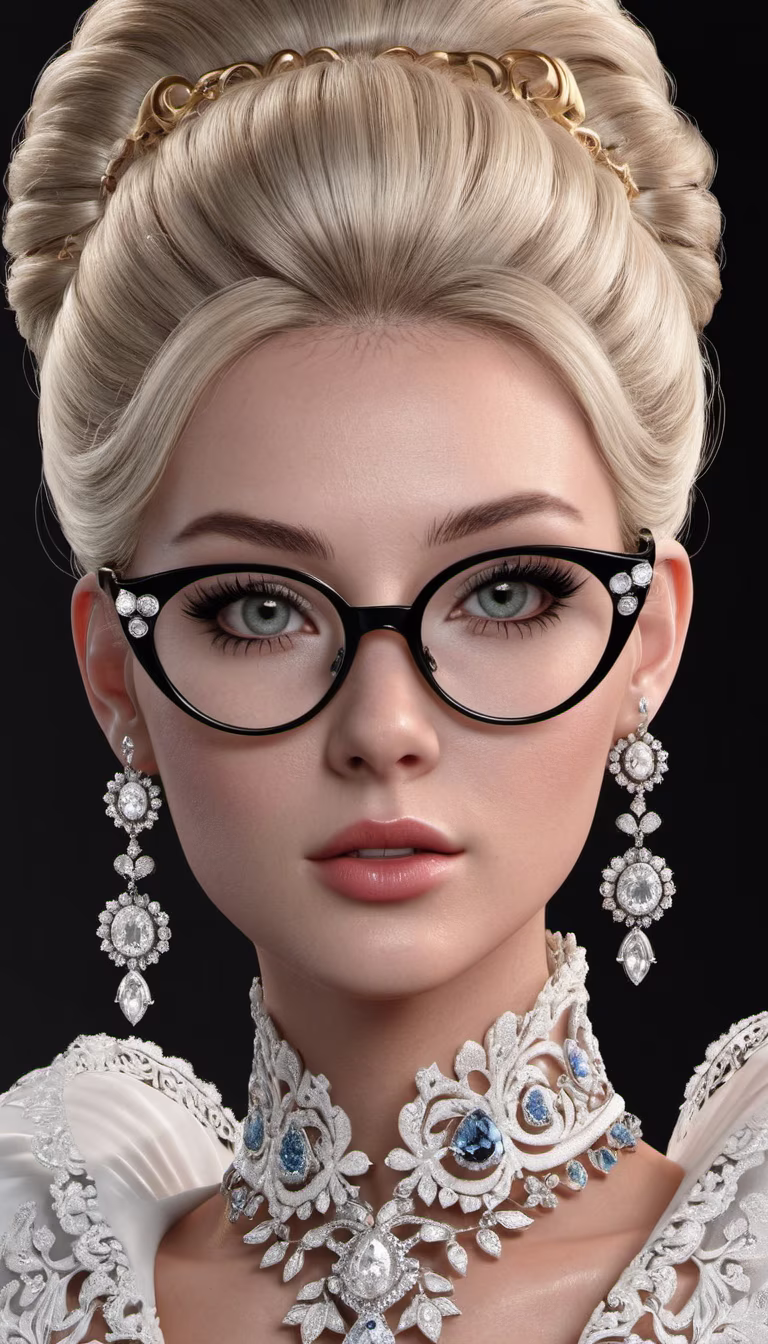 Prompt: gorgeous model, intricate gemstone jewelry, Long updo Hairtyle , Very highly voluminous, very lofty, richly detailed, intricately textured. tumblr, rococo, cool glasses, “diamonds, 🎀 🧟 🍓 🧚, in style of chrome hearts, intense albino, clear eyes. 2 4 mm, heart eyes, couture, super realistic”, intense eyes