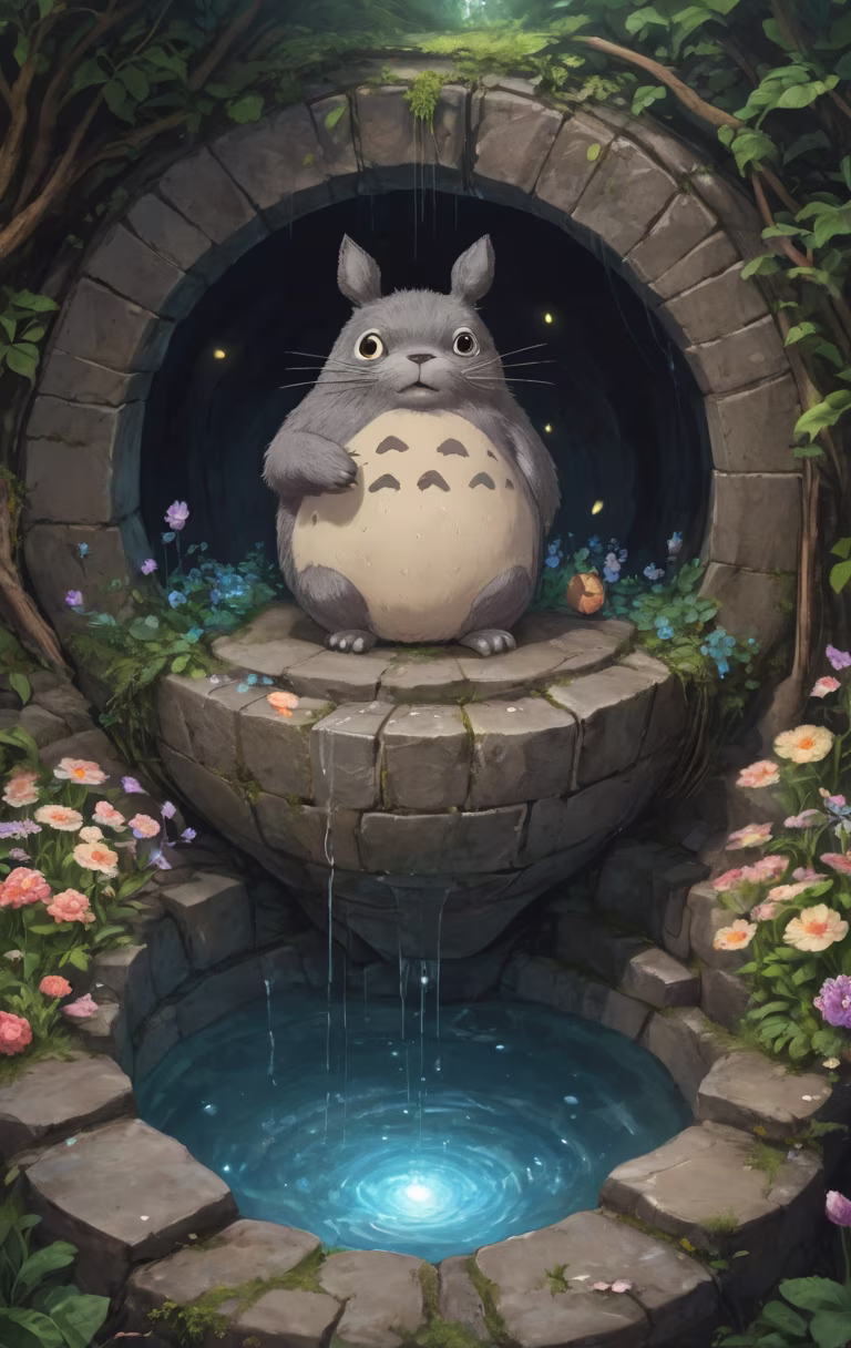 Prompt: Totoro down in a wellwith glowing light and flowers made of stone and clothe, drawn by ghibli studios