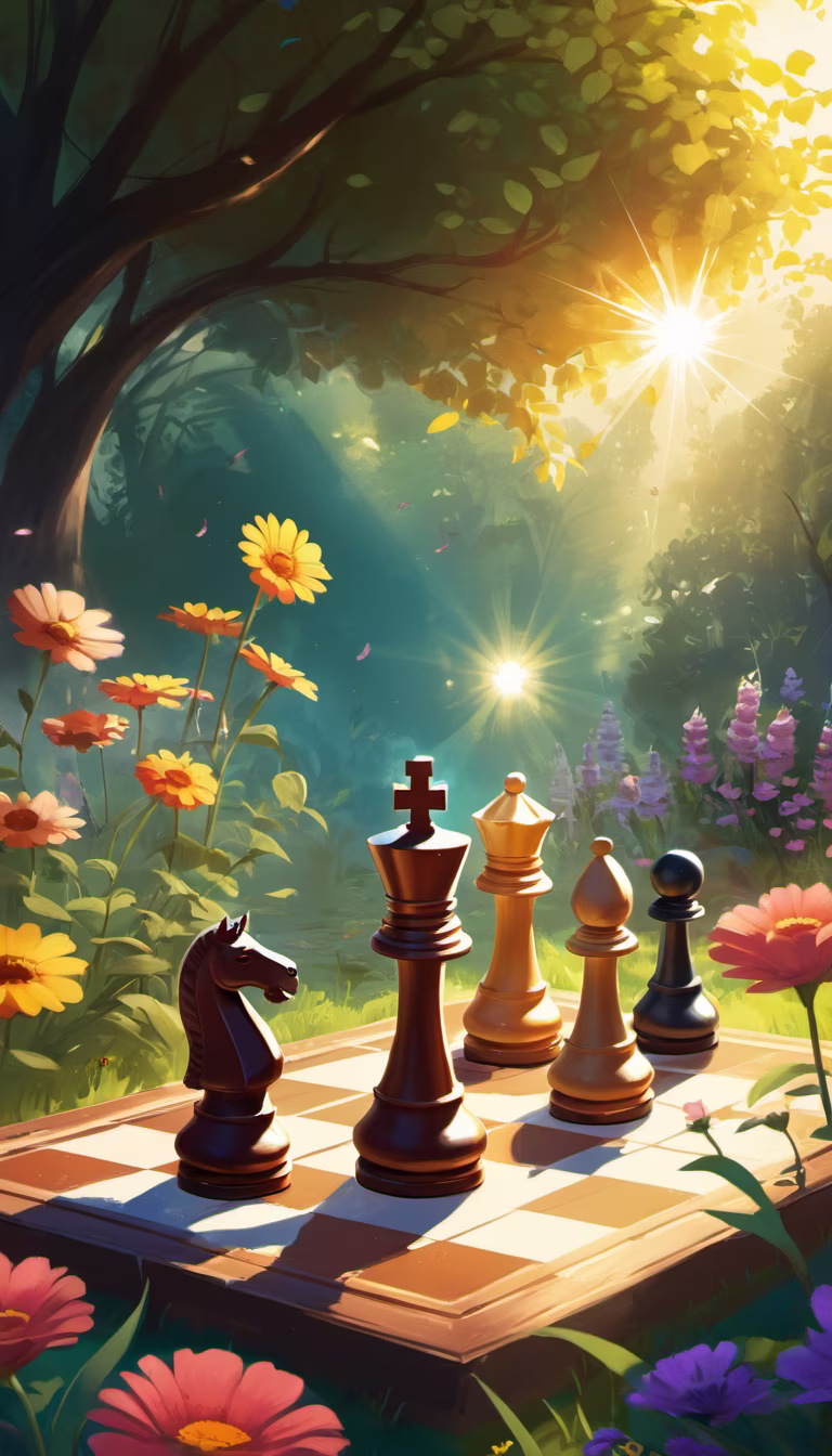 Prompt: The sun is shining, there are many flowers in the garden, a game of chess, a beam of light