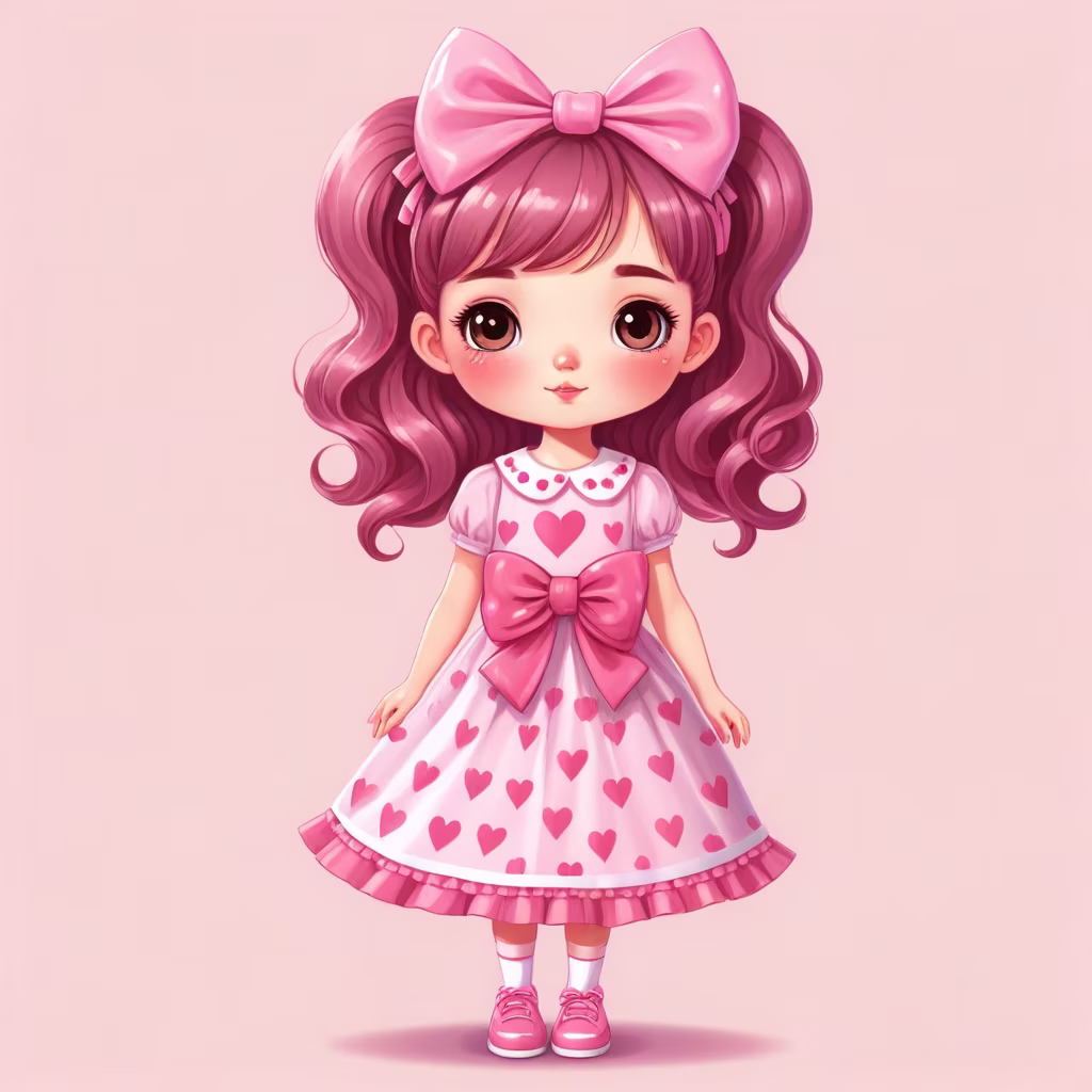 Prompt: cute girl in pink, with bows on her hair, and a heart on her dress, hearts, pink bows, pink simple ornament on the bottom and top, flat style, flat design, kawaii, cute drawing, pattern,