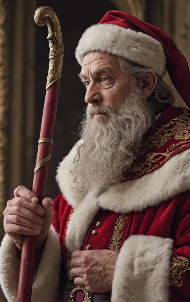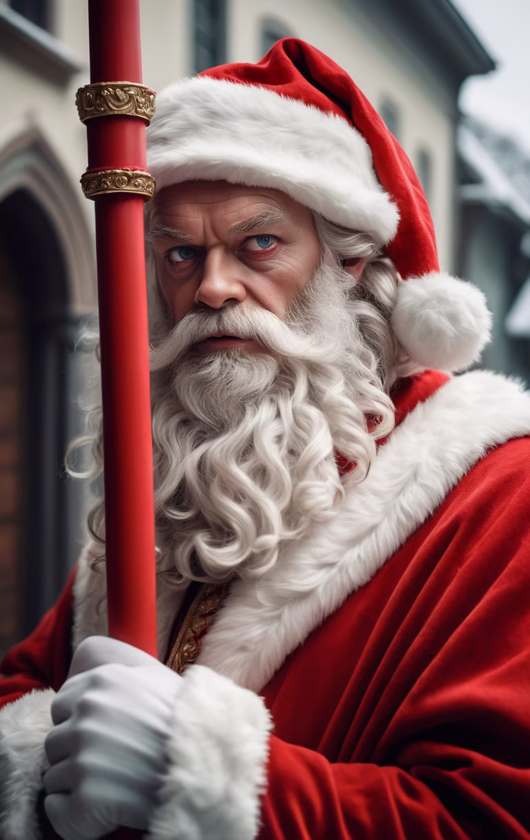 Prompt: man dressed as santa claus holding a red pole, a photo, baroque, nicholas ii of russia, 🎀 🗡 🍓 🧚, information, wintry rumpelstiltskin, eyes!, he is about 5 0 years old, profile picture, grand!, 3 winter deities, hyper-realistic, red and white color scheme, beautiful! Donato Giancola