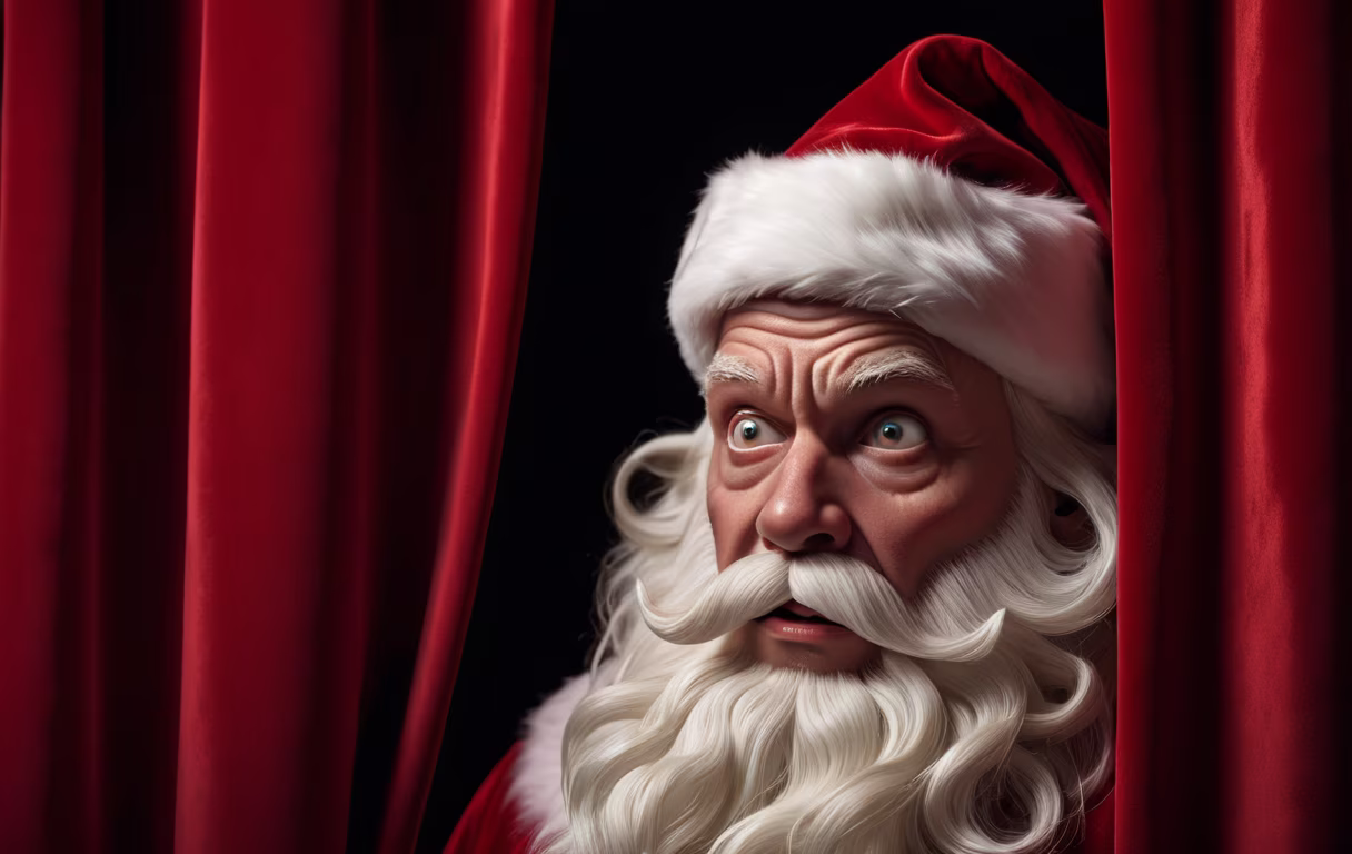 Prompt: Night, in the foreground, a very funny scared Santa Claus looks out and looks directly into the camera from behind a velvet red curtain on the right side, (only his head is visible), (realistic skin texture, wrinkles, realistic human eyes), his mouth is open in surprise, he looks into the camera.
