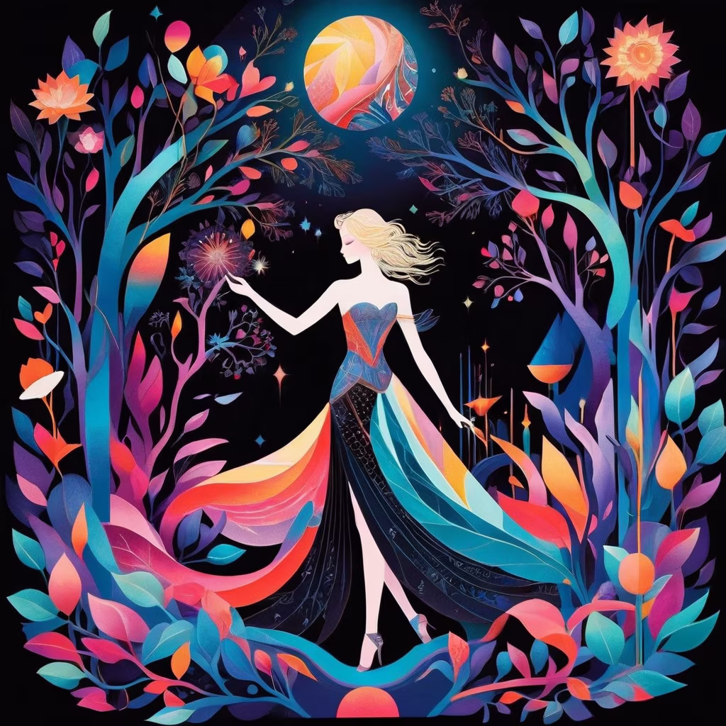 Prompt: Immerse yourself in the aetherial dreamweaver's tale, an enigmatic creature with fur adorned in surreal and dream-inspired patterns, embarking on an odyssey in the ethereal. The intricate patterns on its fur dance with cosmic fractals, surreal couture, prismatic dreams, and the timeless allure of analog film aesthetics. Framed spherometrically, the dreamweaver navigates through exoskeletal paradigm shifts, guided by the goddess's capricious touch. Black branches silhouettes and floral nature botanical elements contribute to a visual narrative where the dreamweaver's odyssey unfolds in the boundless tapestry of the ethereal.