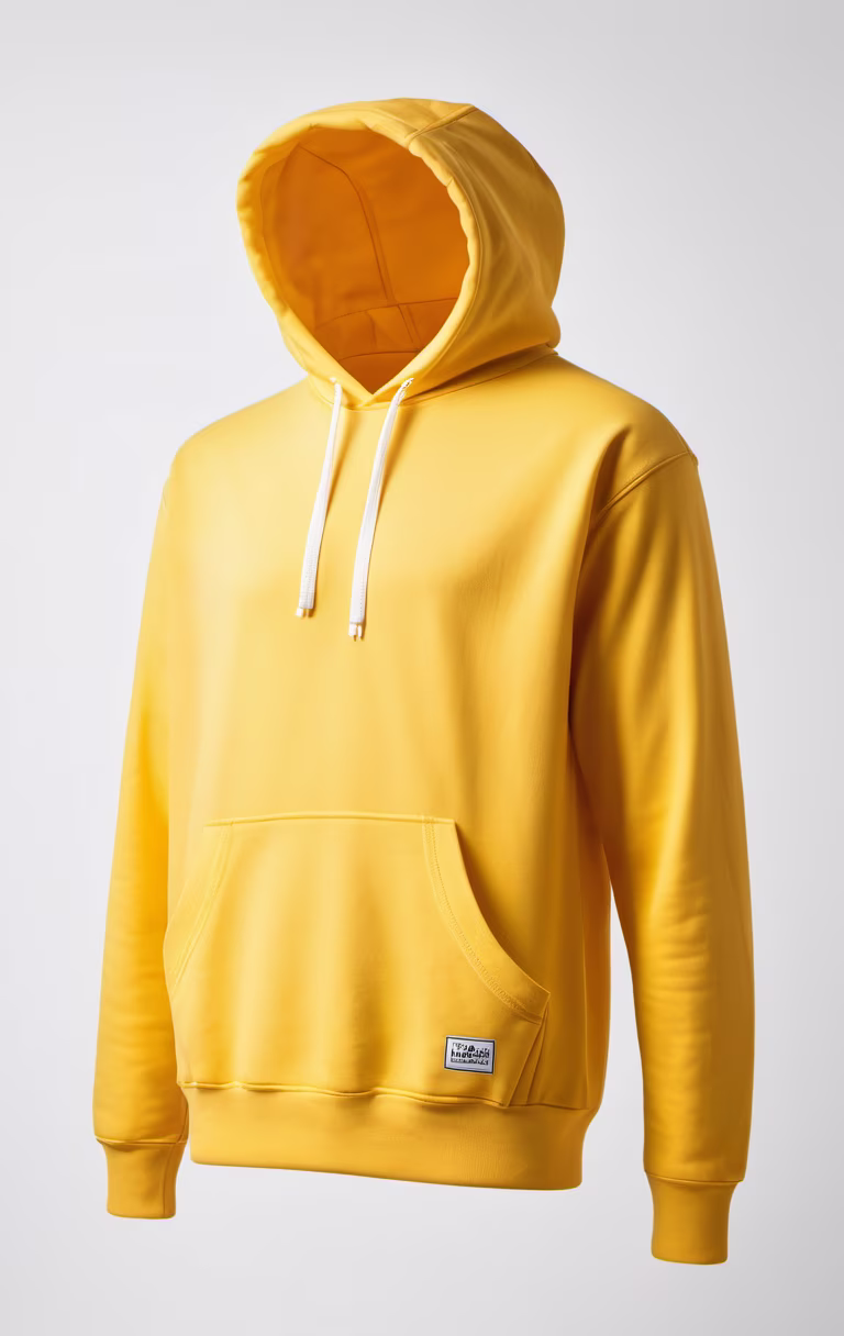Prompt: product photography, yellow cotton hoodie, floating in the air, white background, closeup.