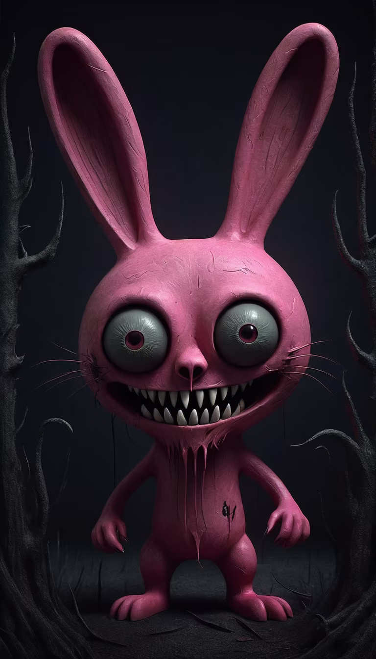 Prompt: (artist Gary Baseman:1.3)(artist ZladislawBeksiński:1.1)(artist Anton Semenov:1.2) (dark fantasy:1.4) drawing, pink Bunny with big eyes and sharp predatory teeth (((The image is drawn in digital format with a high level of detail and emphasis on lighting and textures. It is trending on artstation and has a cinematic look. quality)))