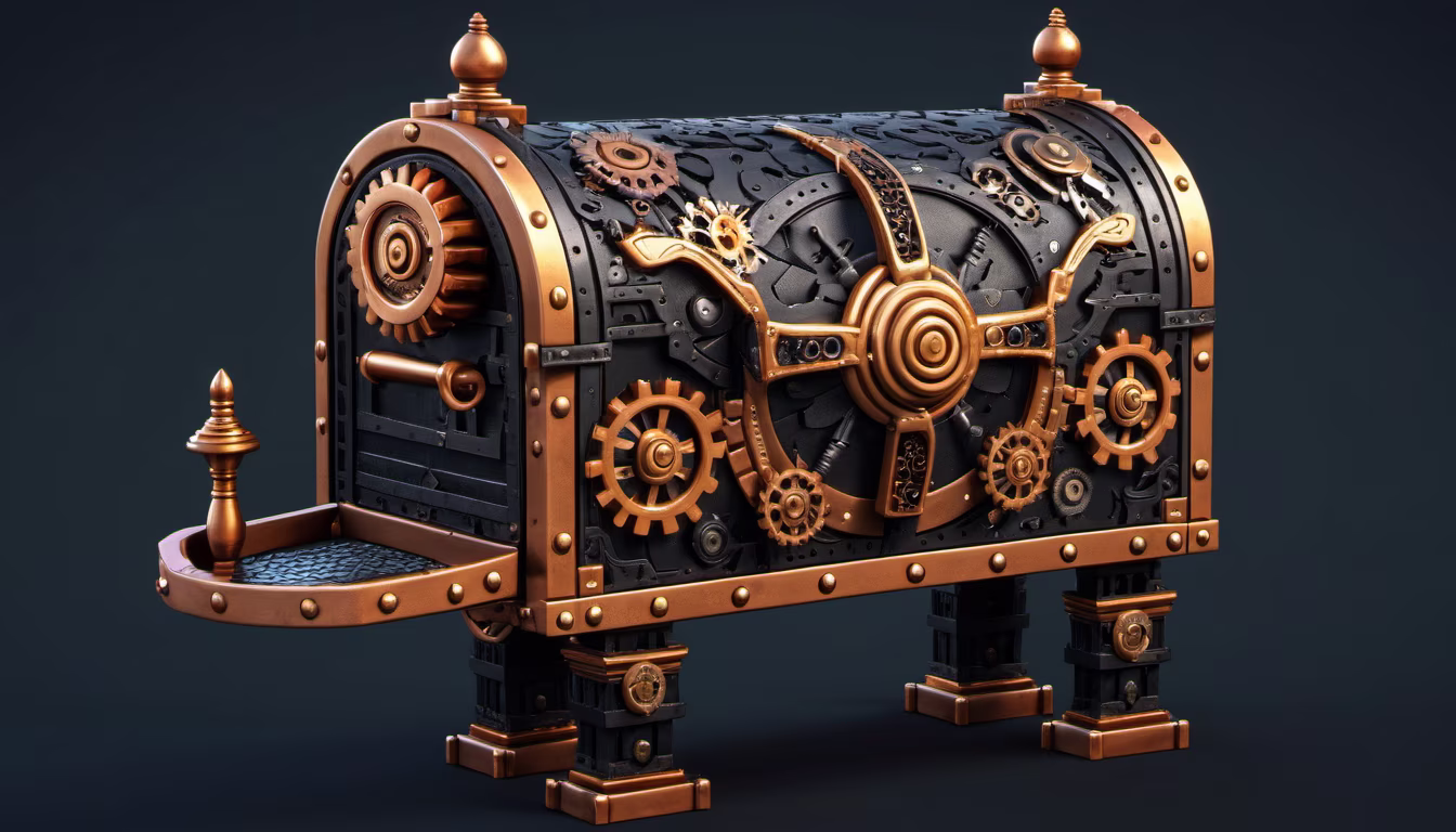 Prompt: steampunk mailbox stylish hardcore iron abstract hardcore incredibly detailed visually stunning overly dramatic visual art unrealistically unusual mailbox hd 3d 32k amazing cold painted black texture with gears, hydraulics, spikes, dark insane texturing road side artwork