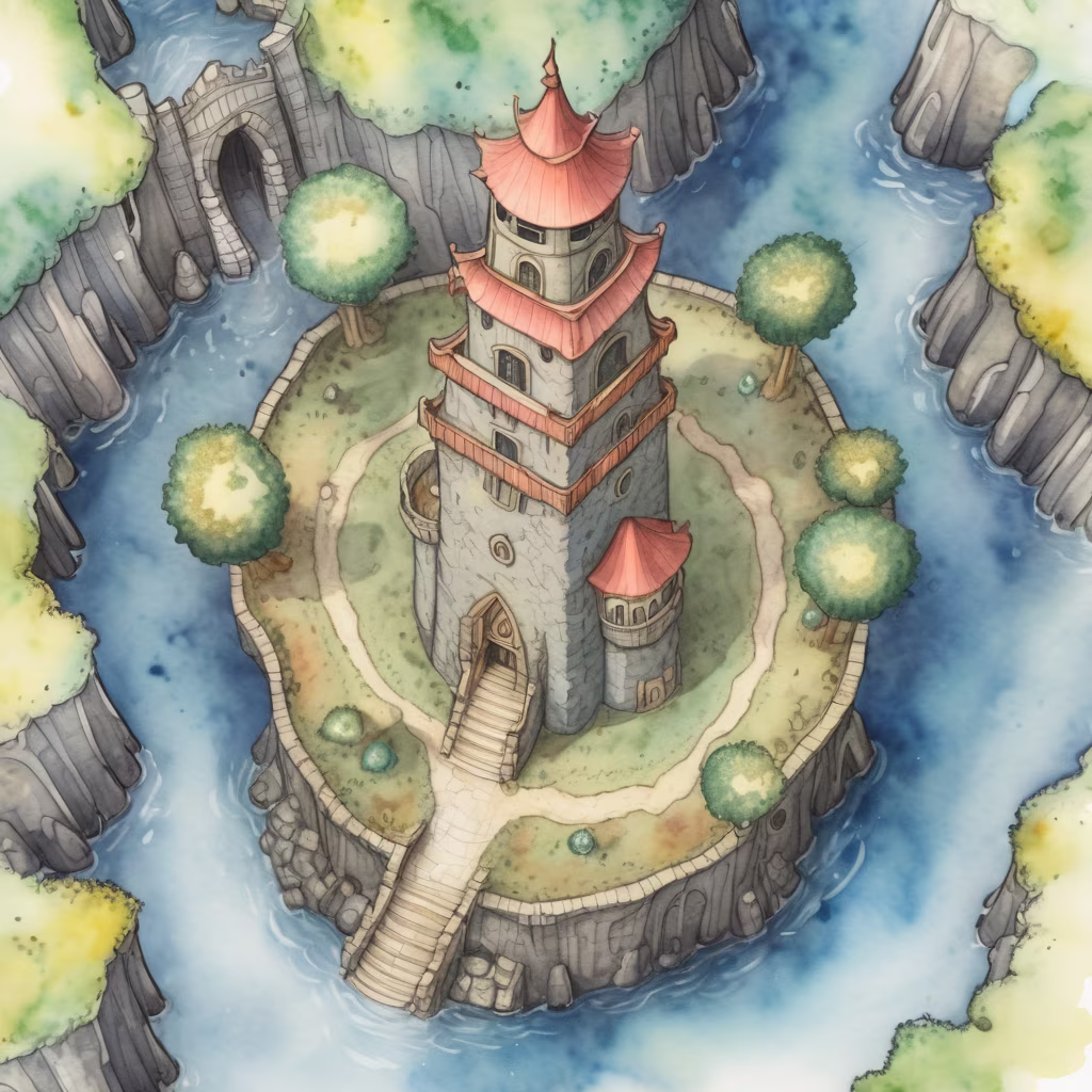 Prompt: top-down battle map of enchanted tower inside a thick, dark and a thorny forest , ghibli style watercolor