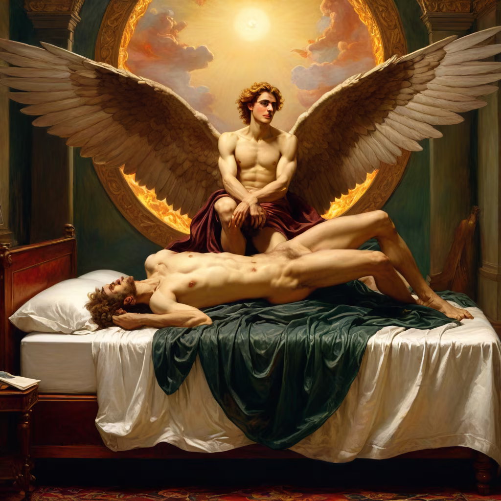 Prompt: painting of a man laying on a bed, and a beautiful angel man near the bed by George Frederic Watts, eros and thanatos, ledmund leighton, by Alexandre Cabanel, herbert james draper, inspired by George Frederic Watts, angel falling to andromeda, luis ricardo falero, by Herbert James Gunn, by Frederic Leighton, hypnos, frank dicksee
