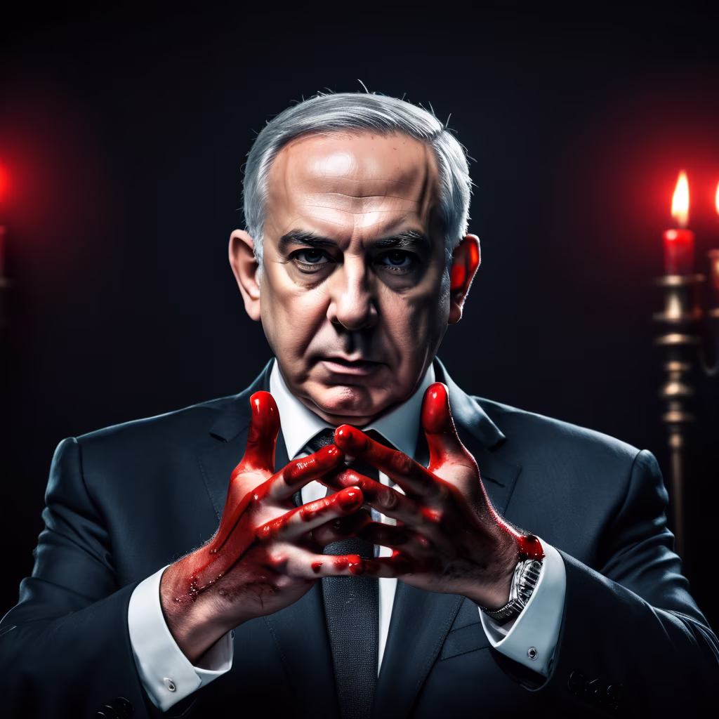 Prompt: Benjamin Netanyahu with blood dripping from his hands