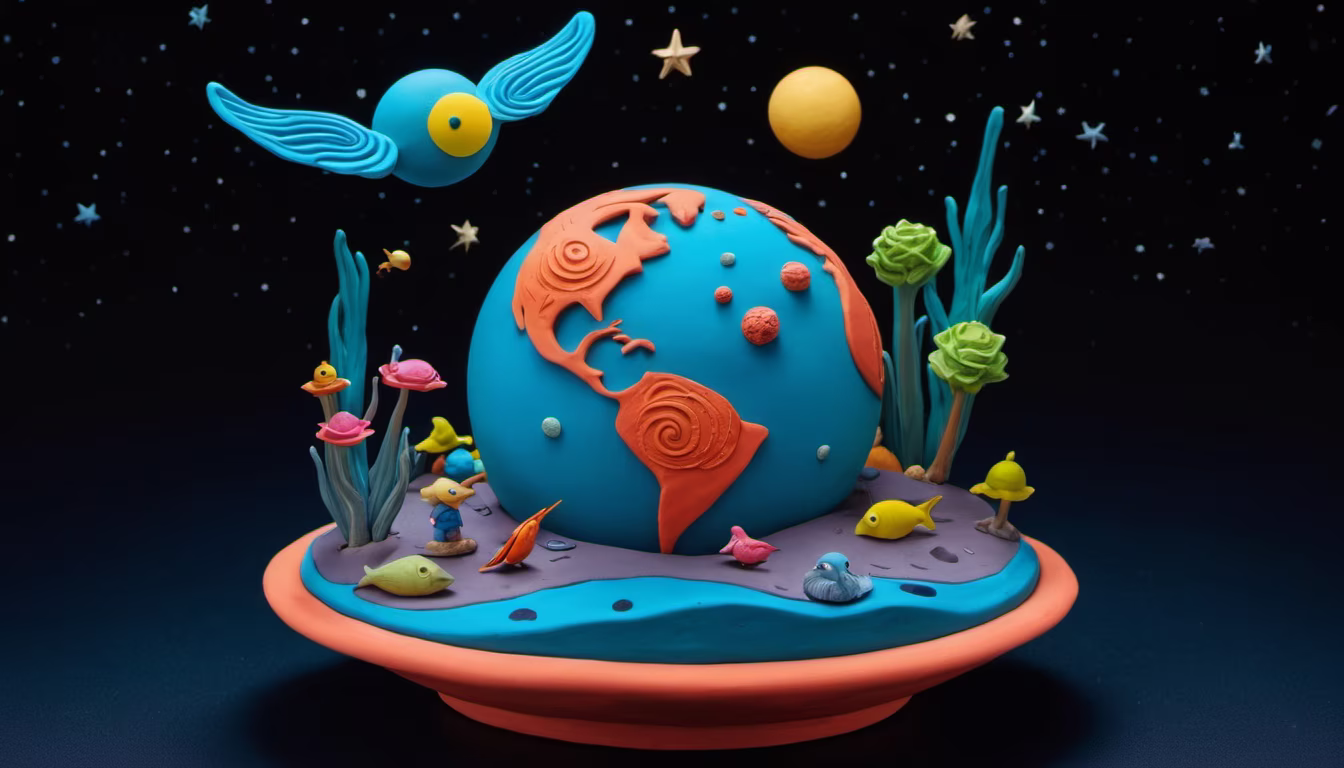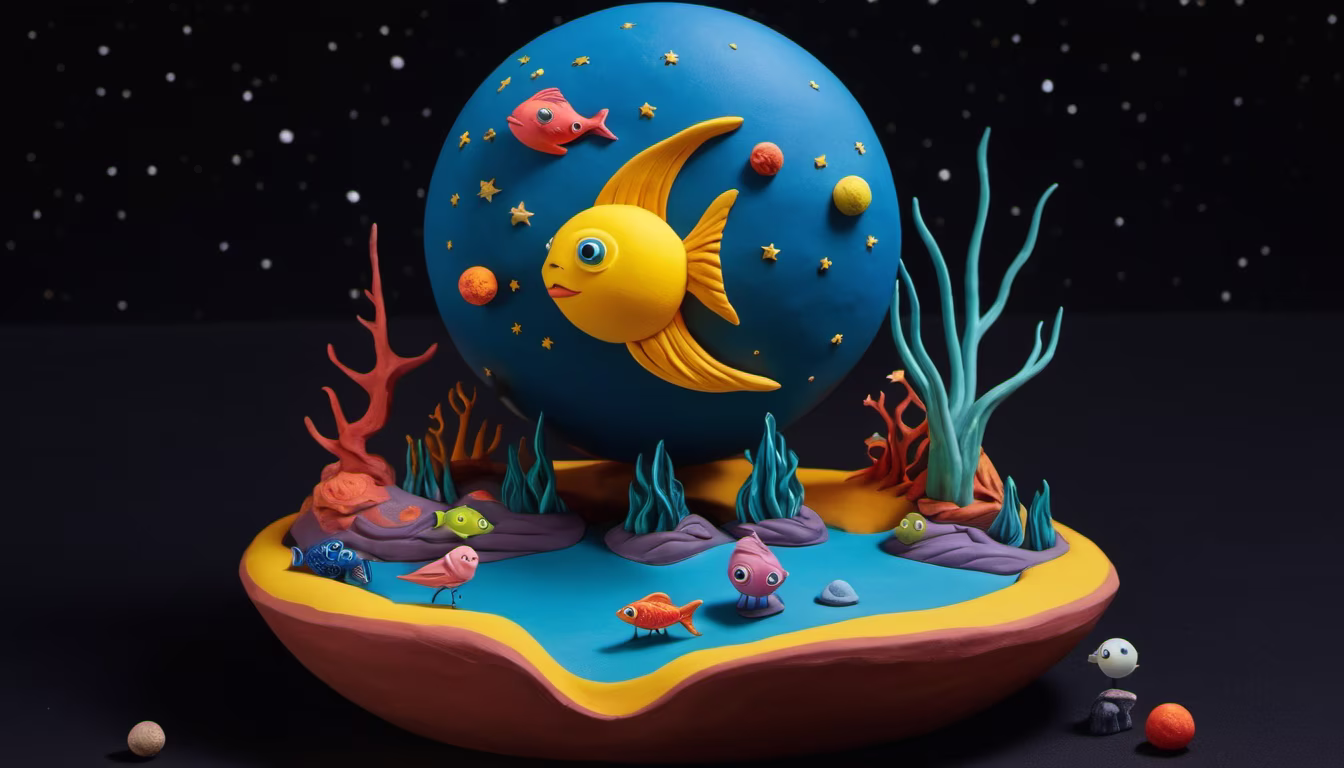 Prompt: surreal exoplanet cool planet where fish fly and birds swim, bioluminescent water ponds, the sky is night starry cosmos planets, scary, ugly, weird