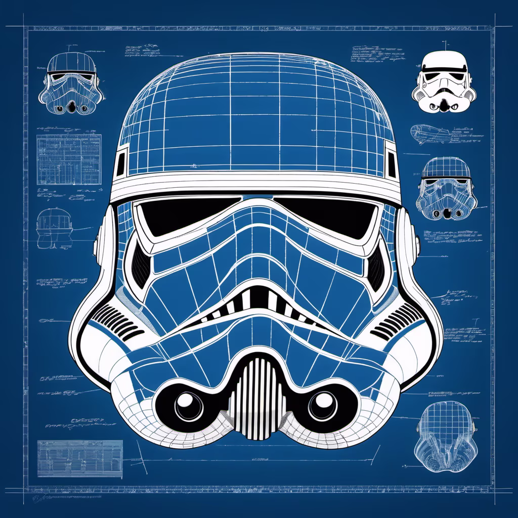 Prompt: blueprint project of stormtrooper helmet technical drawing, blueprint blue paper with white notes, technical drawing project, squared paper, detailed drawing, different angles, no color, sketches