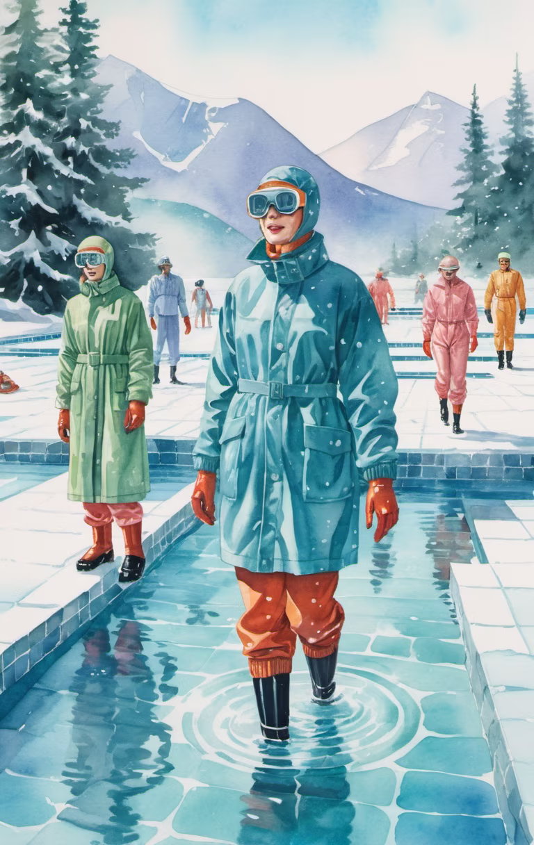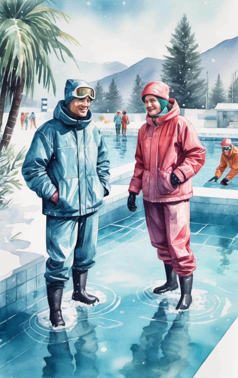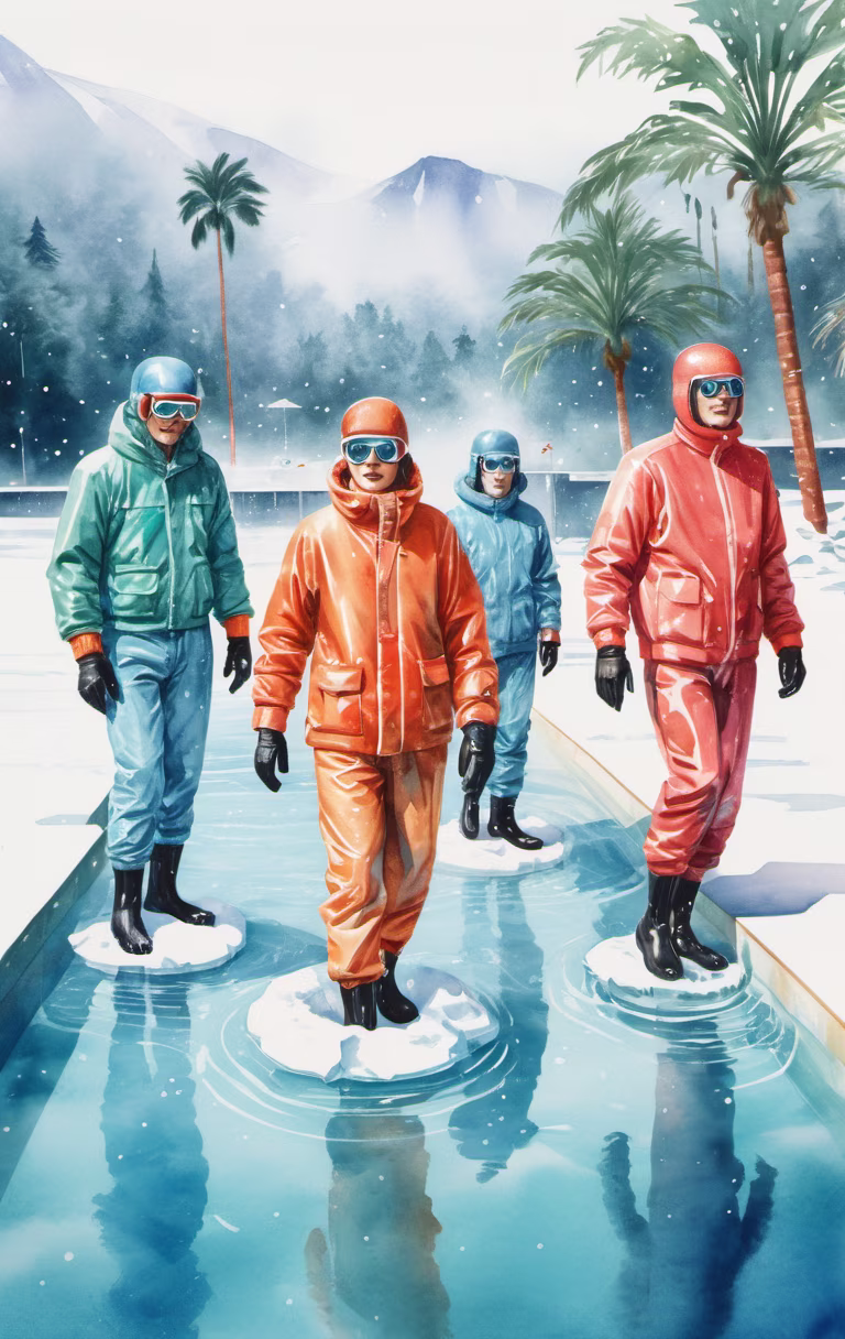 Prompt: 1980s adults wearing snow clothing swimming in a forzen ice swimming pool on a tropical vacation retro-futurism style