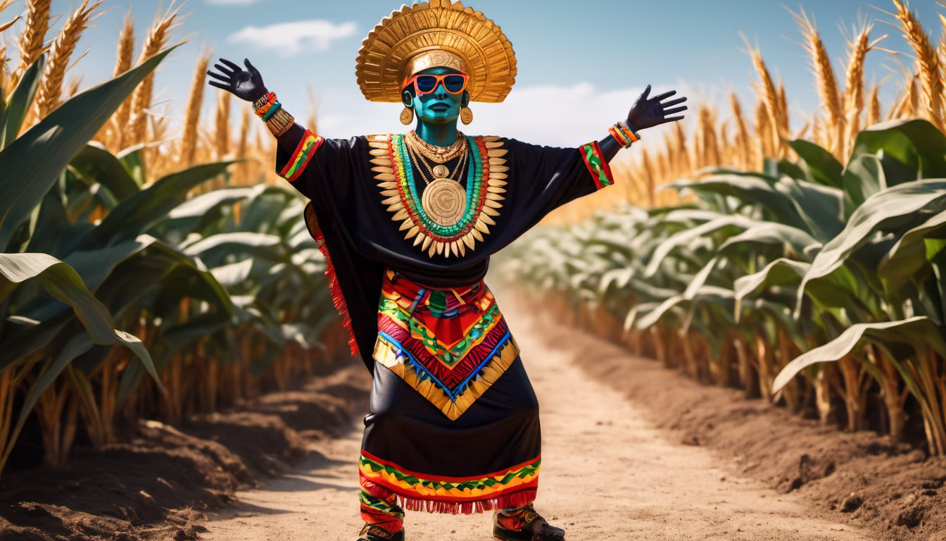 Prompt: A dark Mayan statue, wearing bright Mayan cultural clothing, sunglasses and a gold necklace, dancing on the floor, American hip-hop style, in a Mexican cornfield
