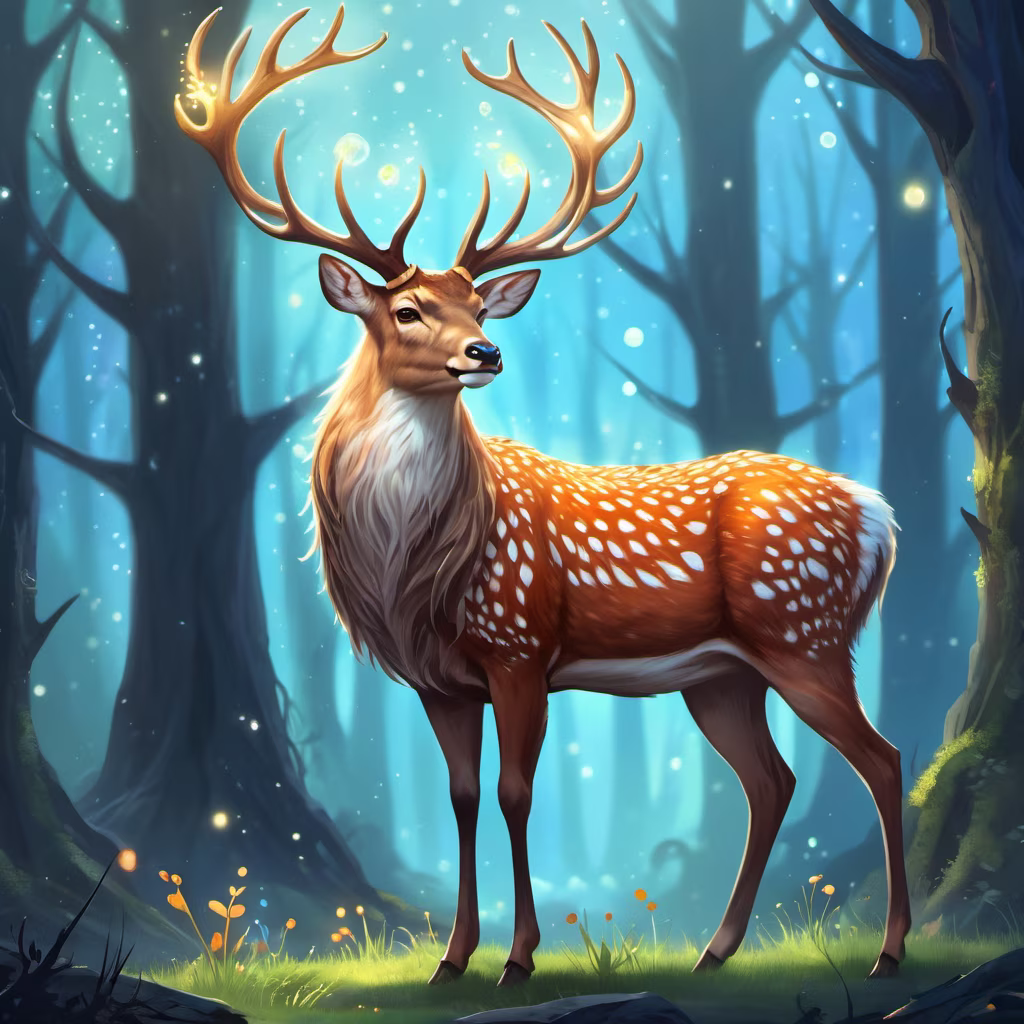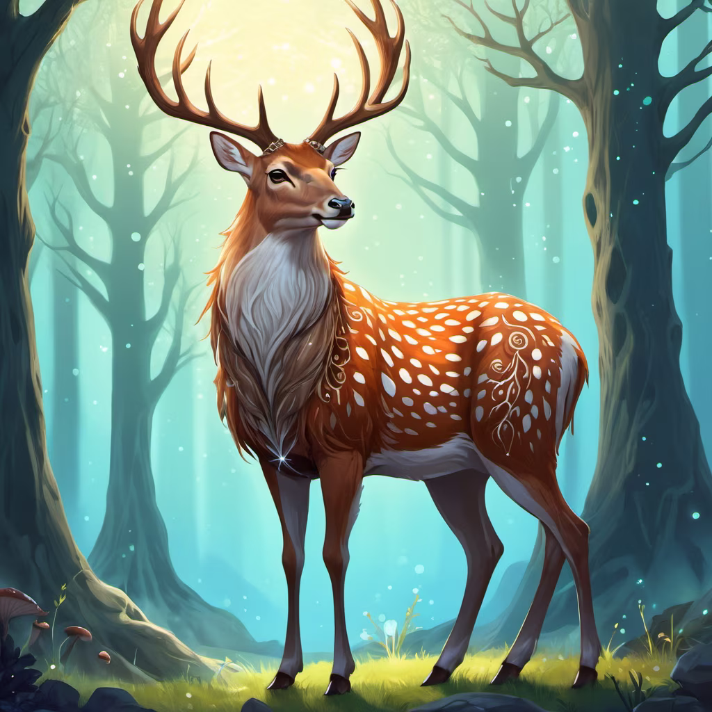 Prompt: a majestic deer whose coat is intertwined with mushroom roots and whose antlers are covered in a thin layer of spores. The deer's eyes glow with a strange glow, revealing the fungal influence. Mushrooms emit a soft glow beneath his fur, creating an atmosphere that is both mystical and eerie.