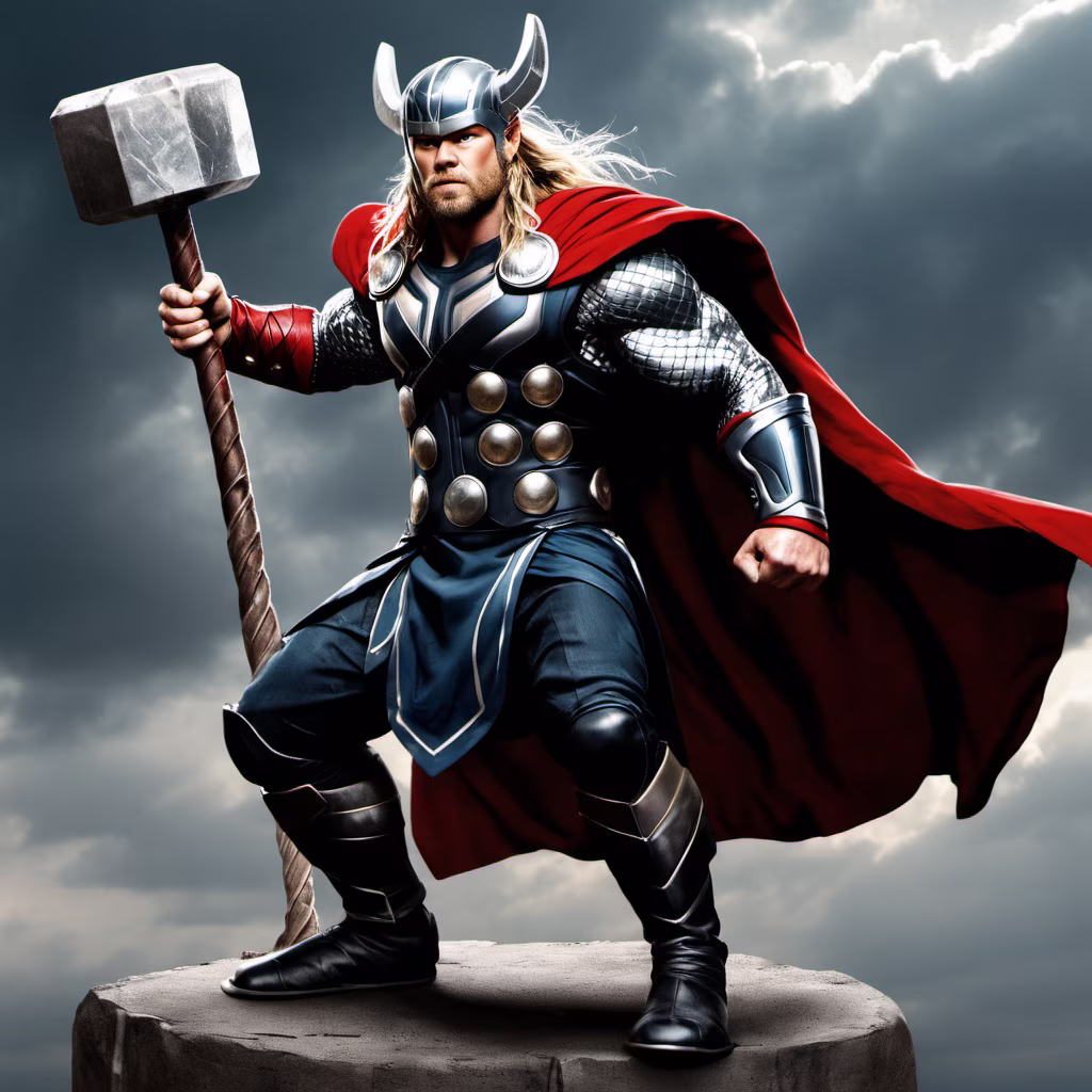 Prompt: Thor, born stout and powerful, possessed exceptional strength, able to hurl and lift ten bearskins