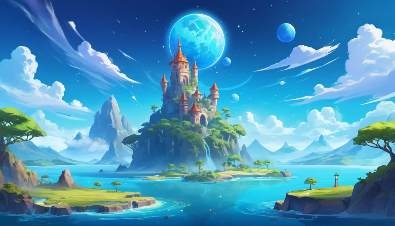 Prompt: landing screen background for a fantasy mobile game which takes place in a flat disk shaped world made up of small islands